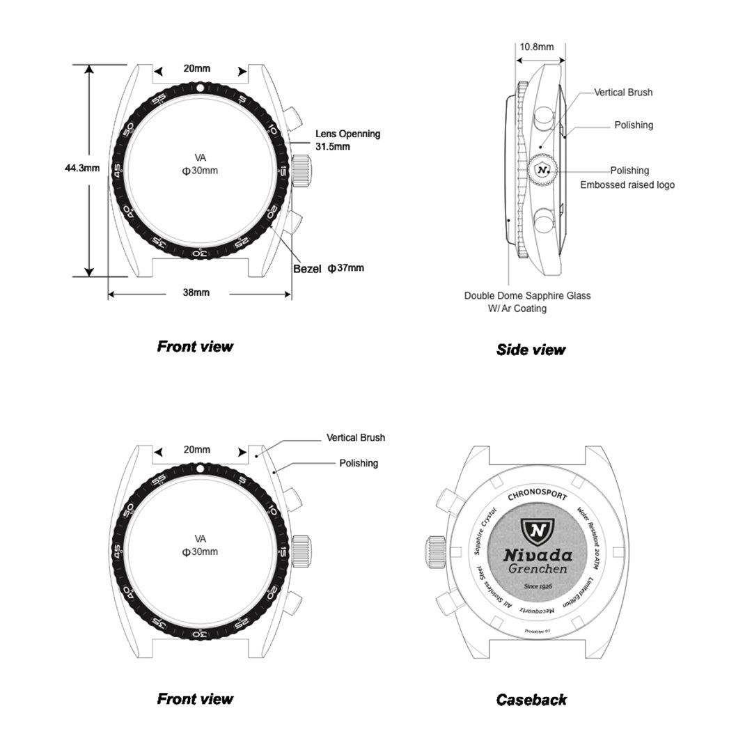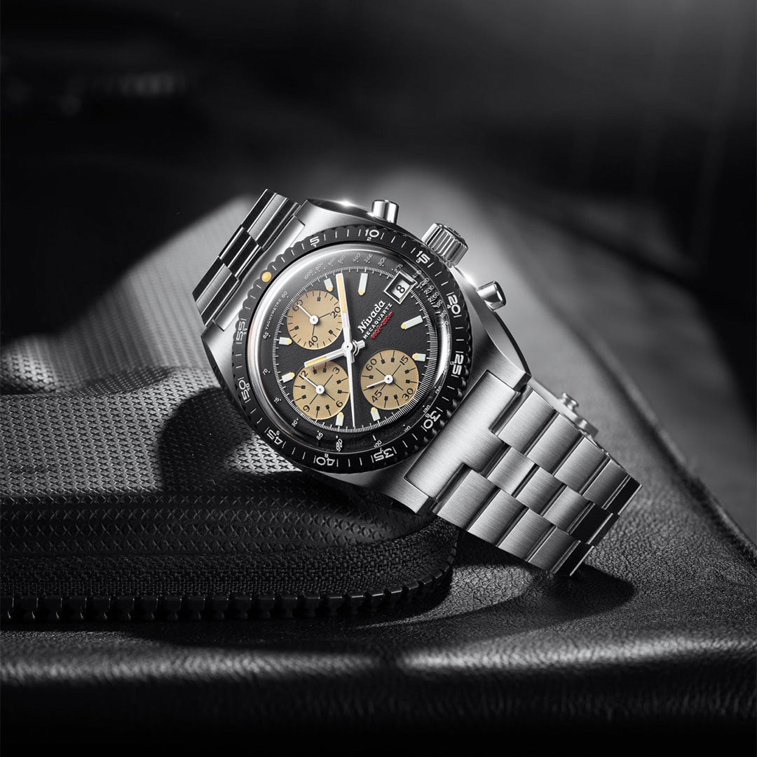 A Quartz Watch with a Mechanical Feel This new version of the Nivada Chronosport features the famous Art Deco-style typography on the sub-dials, here in sand or salmon tones, which illuminate the textured black dial and create depth with a 3D effect. It is powered by a VK67 Meca-Quartz movement with a three-year battery life. The chronograph hand sweeps smoothly across the dial, mimicking the motion of mechanical watches. The principle of a Meca-Quartz movement is to combine the precision of quartz with the beauty of traditional watchmaking, thanks to an automatic movement module. The quartz part provides the timekeeping, while the mechanical module ensures the proper operation of the chronograph (at 6 o’clock). This is why they are often called hybrid movements. The Chronosport Meca-Quartz models are available with multiple strap options, including leather, various styles of steel, and rubber.