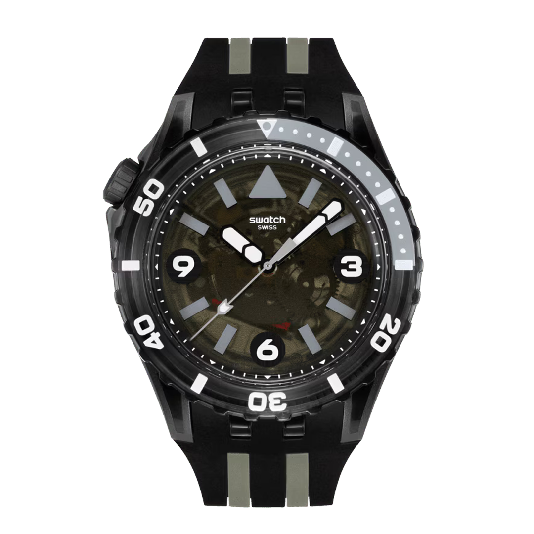 The transparent black dial of this diving watch features gray printed indexes, white printed numerals, black hour and minute hands, and a gray seconds hand, all with glow-in-the-dark effect, under biosourced glass. The case combines matte black Bioceramic and shiny transparent black biosourced material and is paired with a shiny transparent black biosourced bezel with gray and white print that glows in the dark and a matte black Bioceramic crown at 10 o'clock. A matte black and matte transparent black strap with a matte black loop and shiny, transparent black biosourced buckle complete the watch.