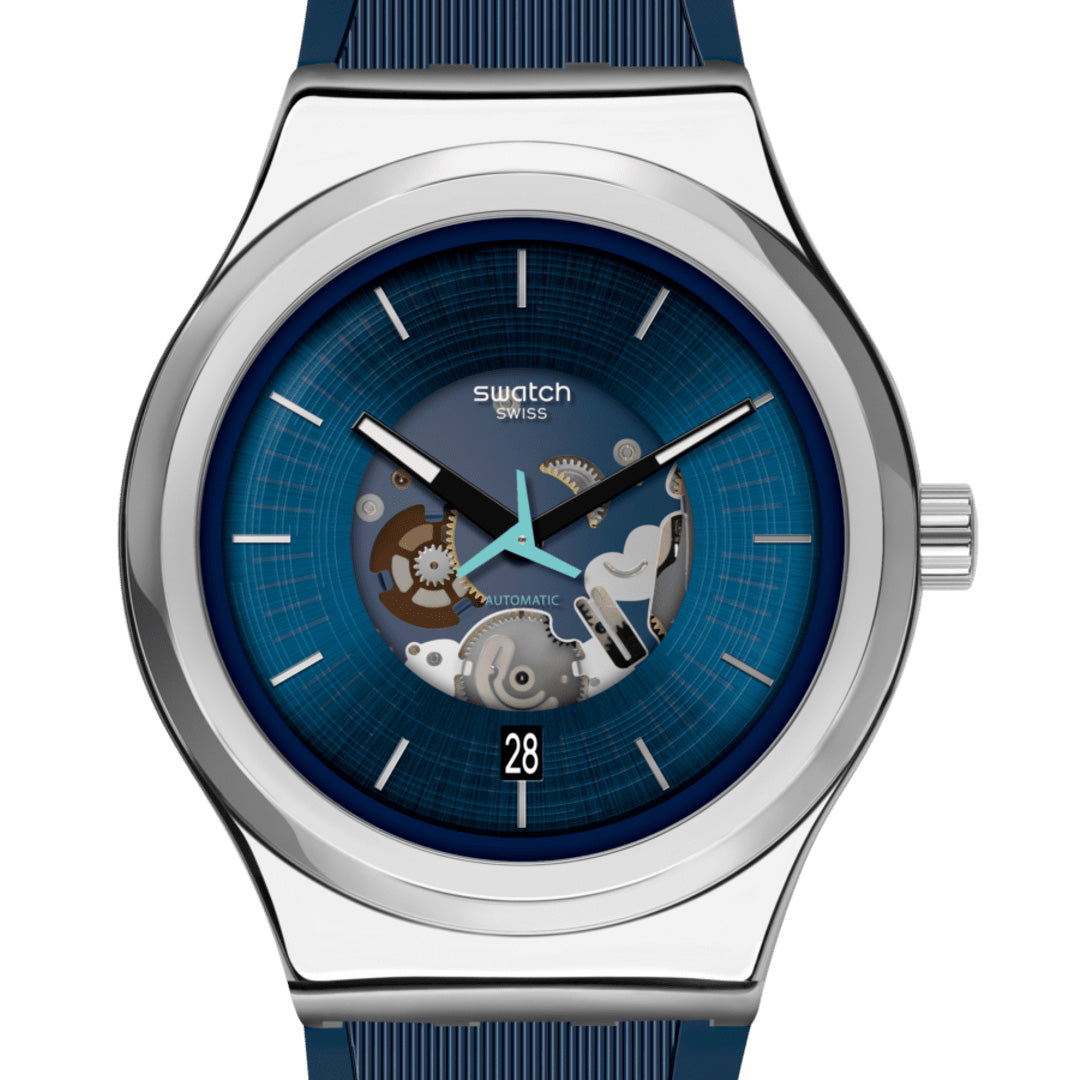 Revealing the magic of the most recent revolutionary innovation in watchmaking, created by Swatch in 2013. SISTEM51 is not only amazing in technical terms (51 components and only 1 screw for a mechanical watch – never seen before!): it is also a beauty to look at. Familiar with the see through watchcase back, where the decorated movement can be appreciated and the secret of magic of the transparent oscillating weight can be discovered? Now also the front of the watch unveils its secrets – and the lovers of details will enjoy the three-winged seconds’ hand, previously spotted only on the iconic and very limited SISTEM51 Flymagic, here in an irreverent dynamic turquoise blue color. Be it the navy blue and shiny stainless steel, for the city style maker, or in full grey with cool matt finish for the lovers of adventurous nightlife, the Nivachron spiral allows for highest possible resistance to magnetic fields, making these the most precise companions, ready to resist any shock and any strong emotion.