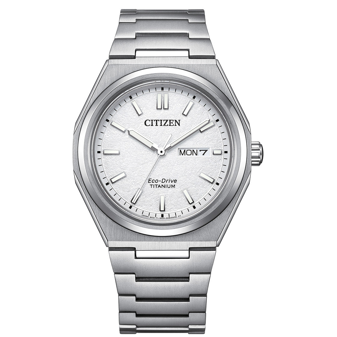 Pairing classic proportions and innovative technology with a distinctly modern style, we present our new Zenshin series. Made with our proprietary material, Super Titanium™, which is five times harder and 40% lighter than stainless steel and is scratch- and rust-resistant, this sporty timepiece features a 39mm silver-tone Titanium™ case that is elevated with finely brushed and polished finishing while being secured to the wrist with an integrated matching bracelet. On the dial, a textured white color is accented with an outer minute ring in black, with silver-tone details and luminous hands and markers. A combined day-date window at the 3 o’clock position adds daily utility and hints at the watch’s retro-style inspirations. Sustainably powered by any light with Eco-Drive technology and never needing a battery, this versatile watch is also water resistant to 100 meters.