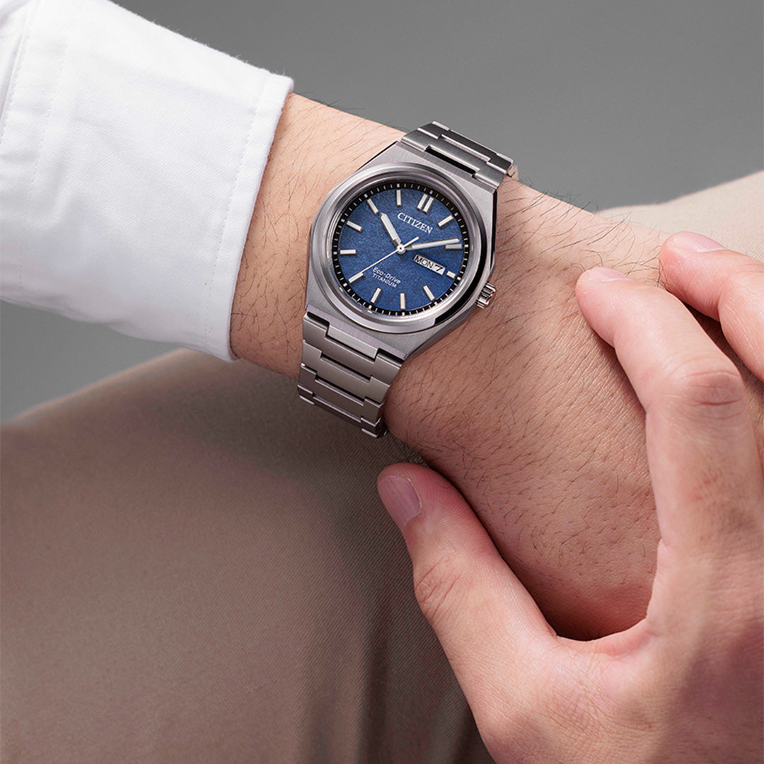 Pairing classic proportions and innovative technology with a distinctly modern style, we present our new Zenshin series. Made with our proprietary material, Super Titanium™, which is five times harder and 40% lighter than stainless steel and is scratch- and rust-resistant, this sporty timepiece features a 39mm silver-tone Titanium™ case that is elevated with finely brushed and polished finishing while being secured to the wrist with an integrated matching bracelet. On the dial, a textured white color is accented with an outer minute ring in black, with silver-tone details and luminous hands and markers. A combined day-date window at the 3 o’clock position adds daily utility and hints at the watch’s retro-style inspirations. Sustainably powered by any light with Eco-Drive technology and never needing a battery, this versatile watch is also water resistant to 100 meters.