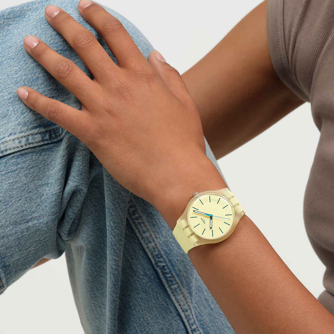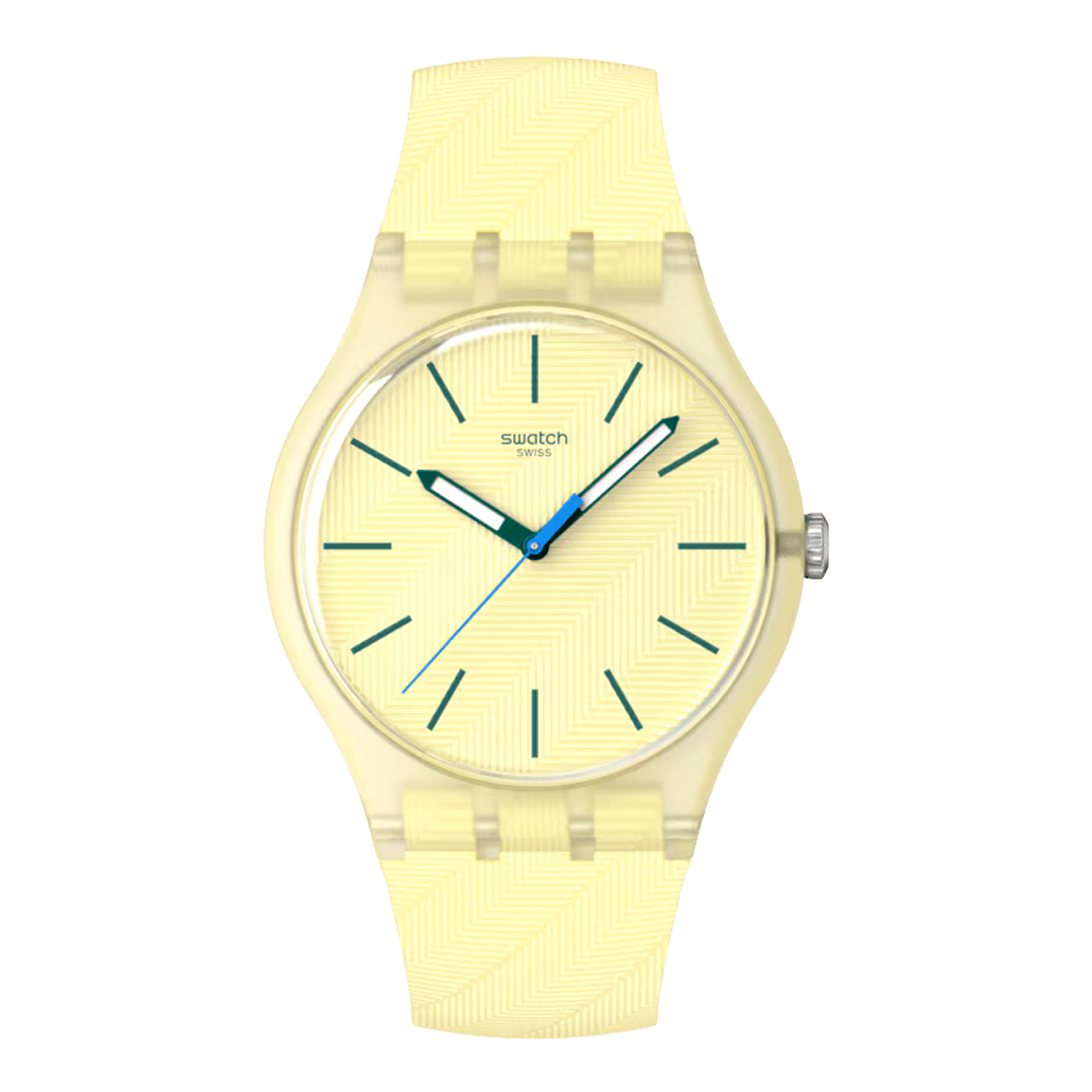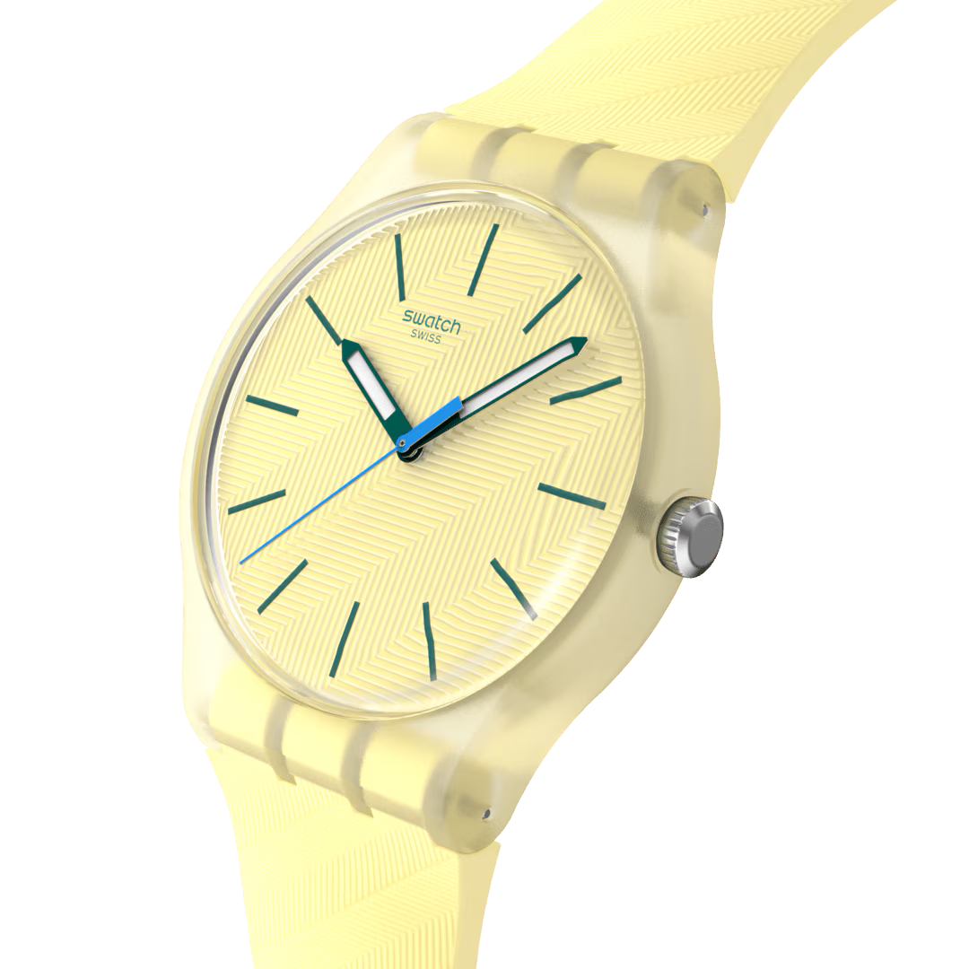 This watch features a textured light yellow dial with dark green printed hour markers, dark green hour and minute hands with glow-in-the-dark effect, and a blue seconds hand in a matte transparent light yellow biosourced case with biosourced glass. A textured, matte light yellow strap with matte transparent light yellow loop and buckle completes the watch.