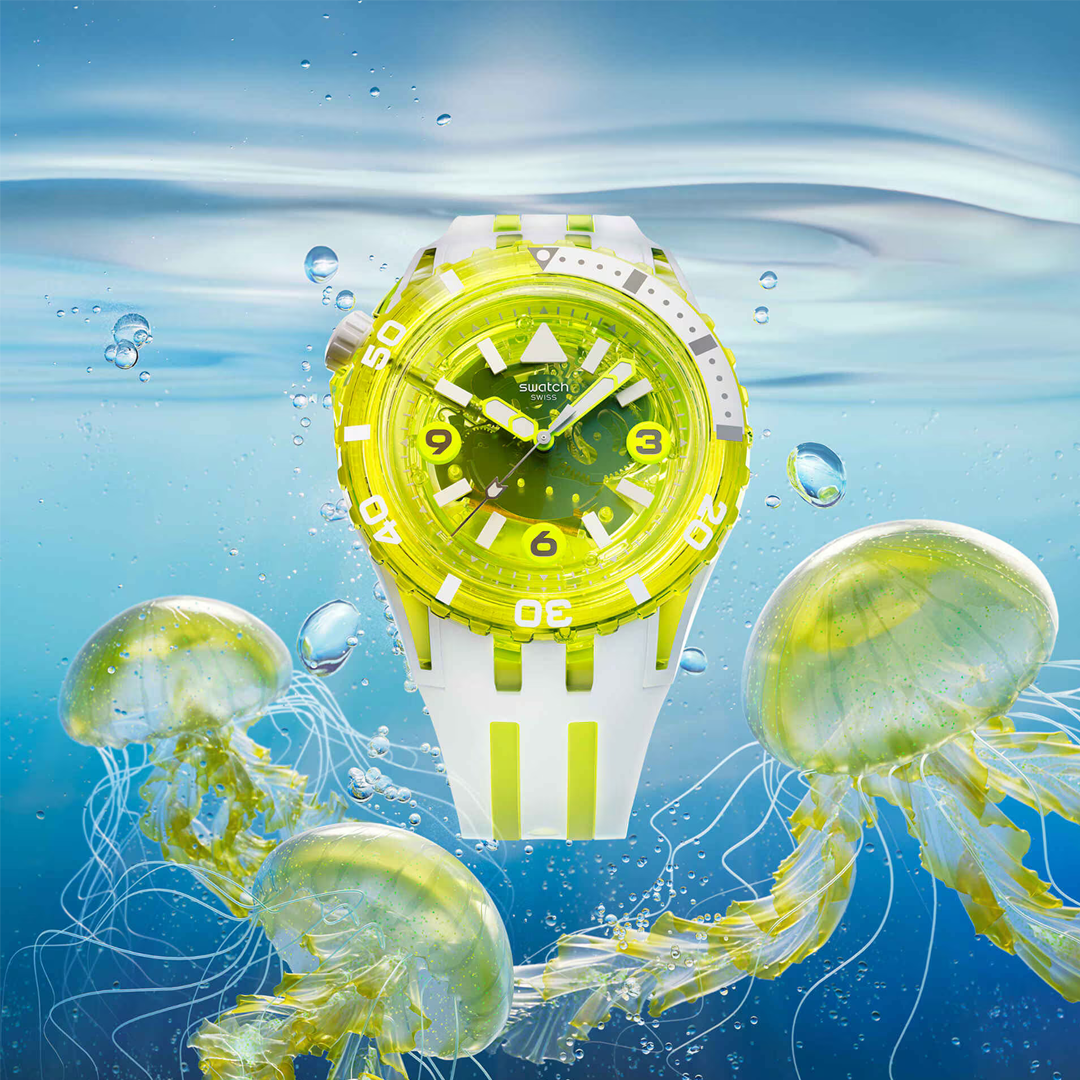 The transparent yellow dial of this diving watch features white printed indexes, gray printed numerals, yellow hour and minute hands, and a gray seconds hand, all with glow-in-the-dark effect, under biosourced glass. The case combines matte white Bioceramic and shiny transparent yellow biosourced material and is paired with a shiny transparent yellow biosourced bezel with gray and white print that glows in the dark and a matte white Bioceramic crown at 10 o'clock. A matte white and matte transparent yellow strap with a matte white loop and shiny, transparent yellow biosourced buckle complete the watch.