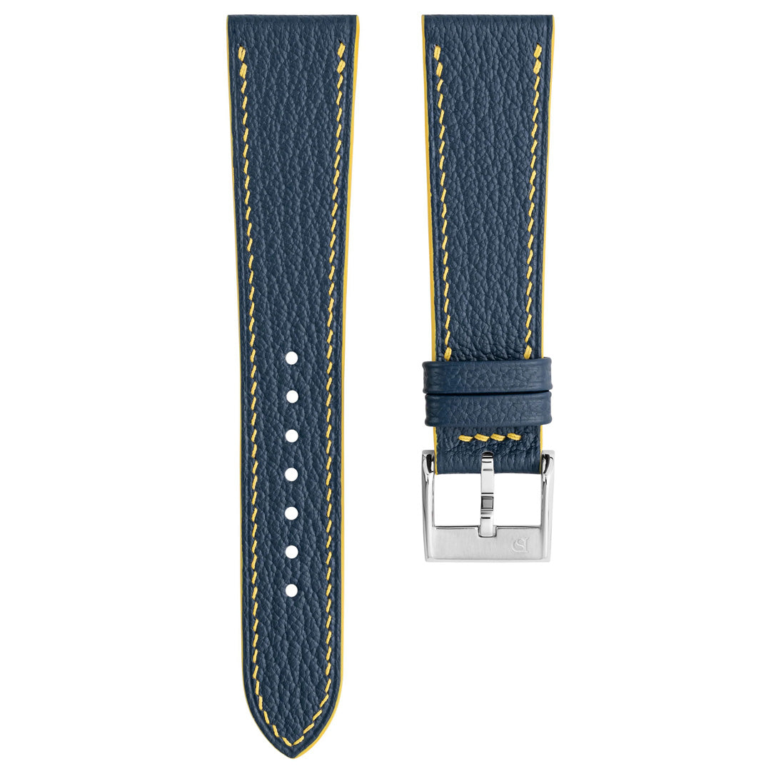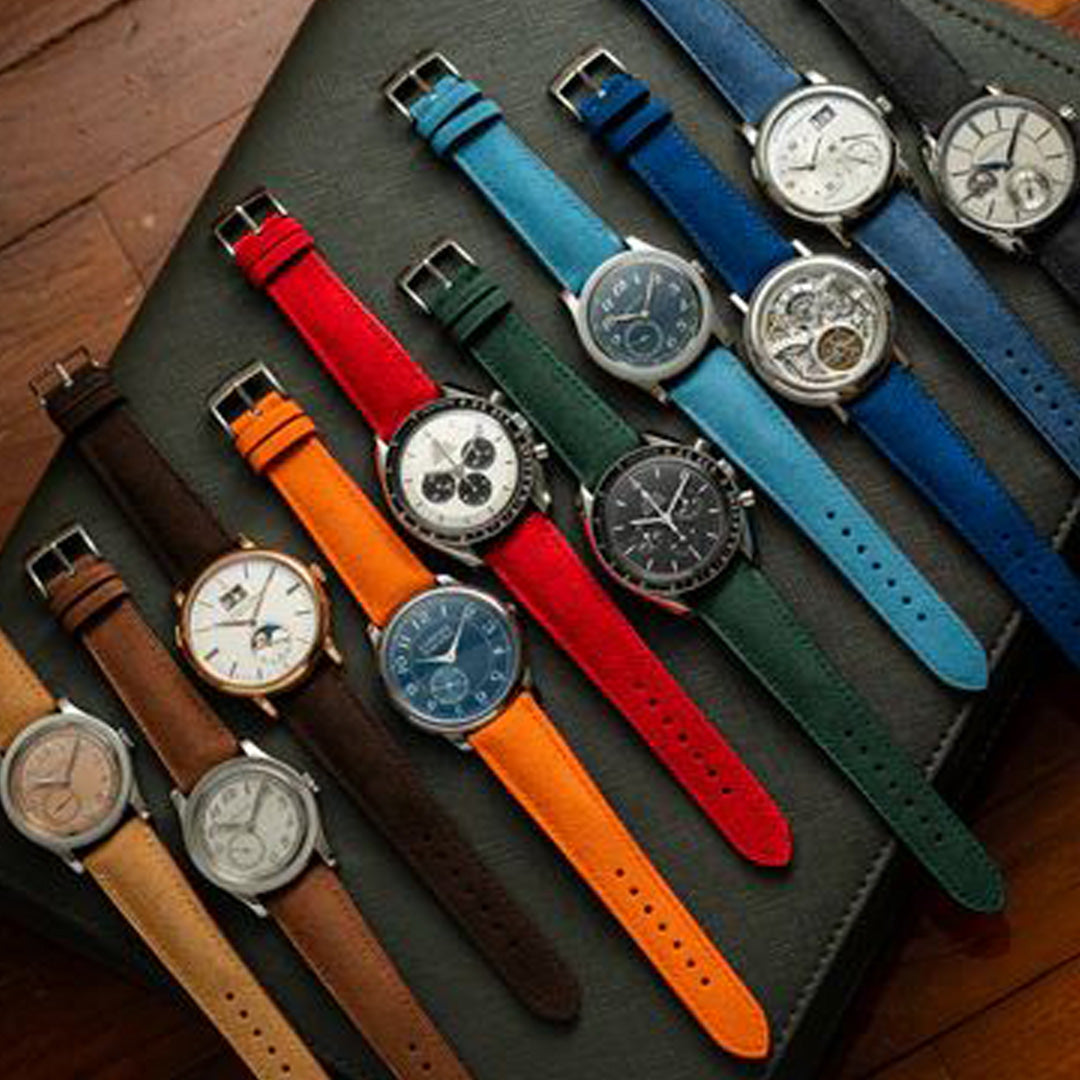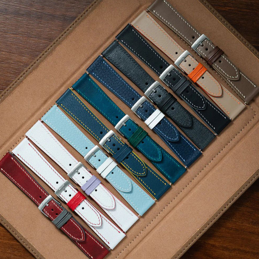 We've developed a total of 11 designs, curated to compliment each of the first 11 MoonSwatches, allowing the pairing to be seamless. These straps use the same leather and style from straps you love from Delugs, but with characteristics of two-tone accents in the stitching, edge paint and keepers.