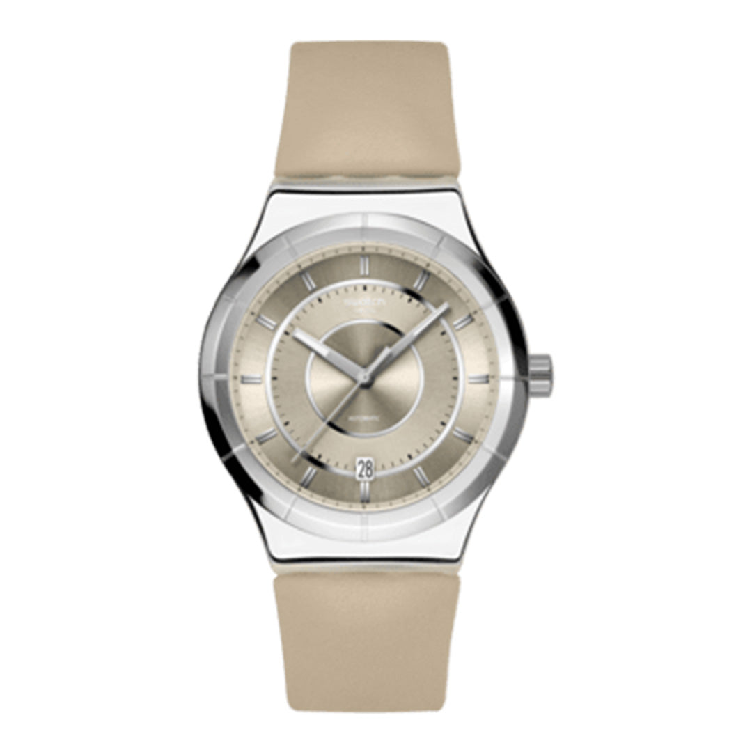 This sleek automatic watch sports a taupe sun-brushed dial with silver-colored hour markers, rings, hour and minute hands with glow-in-the-dark effect and a white seconds hand as well as a white date window with black print at 6 o'clock. The shiny stainless steel case is complemented by a matching bezel with engraved hour markers and gives a view of the SISTEM51 movement with digital printed design on the back. A taupe and beige leather strap, taupe leather loops and shiny stainless steel buckle complete the look.