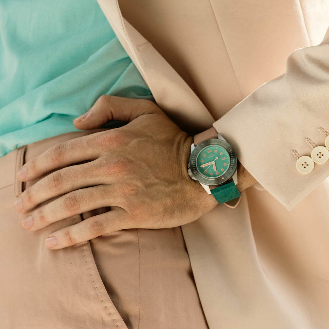 The UNIMATIC Modello Uno U1-RIO, a RIOCAM watch collaboration, blends Italian craftsmanship with Miami-inspired color and style.Vibrant verde acqua and blush pink suede quick-release straps with RIOCAM lining
