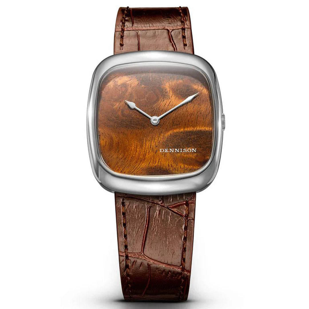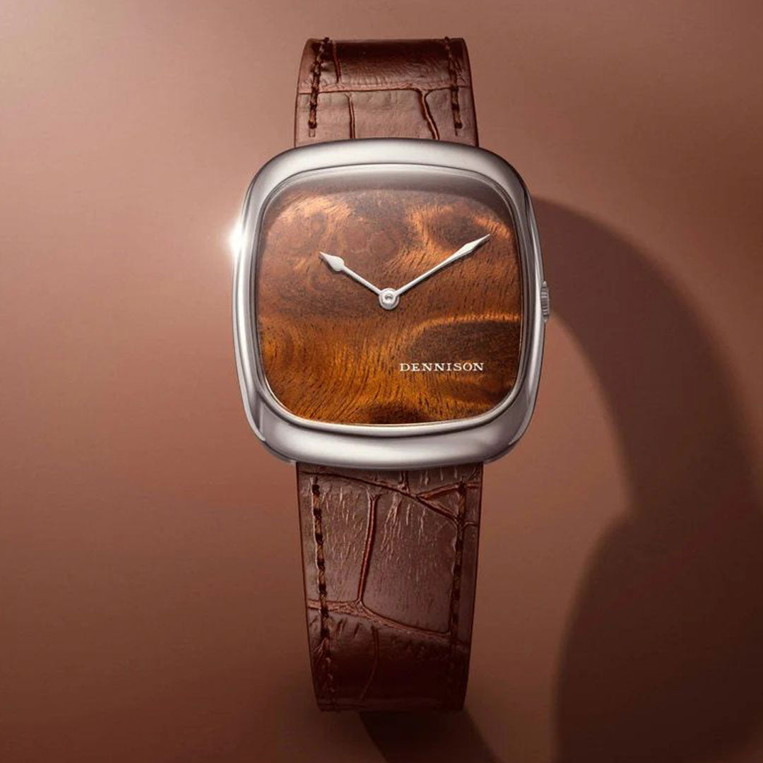 A distinguished revival of the classic Dennison cushion case, the ALD Collection channels the refined aesthetics and flair of the 1960s. The dial features natural wood, selected for its organic grain and warm, earthy tones. Blending vintage flair and contemporary style for a timeless statement. Available in PVD gold and stainless steel, the case measures 37mm by 33.5mm, and 6mm thickness. Complemented by a brown embossed leather strap with bespoke pin-buckle that reflects the elegant curvature and finish of the case.