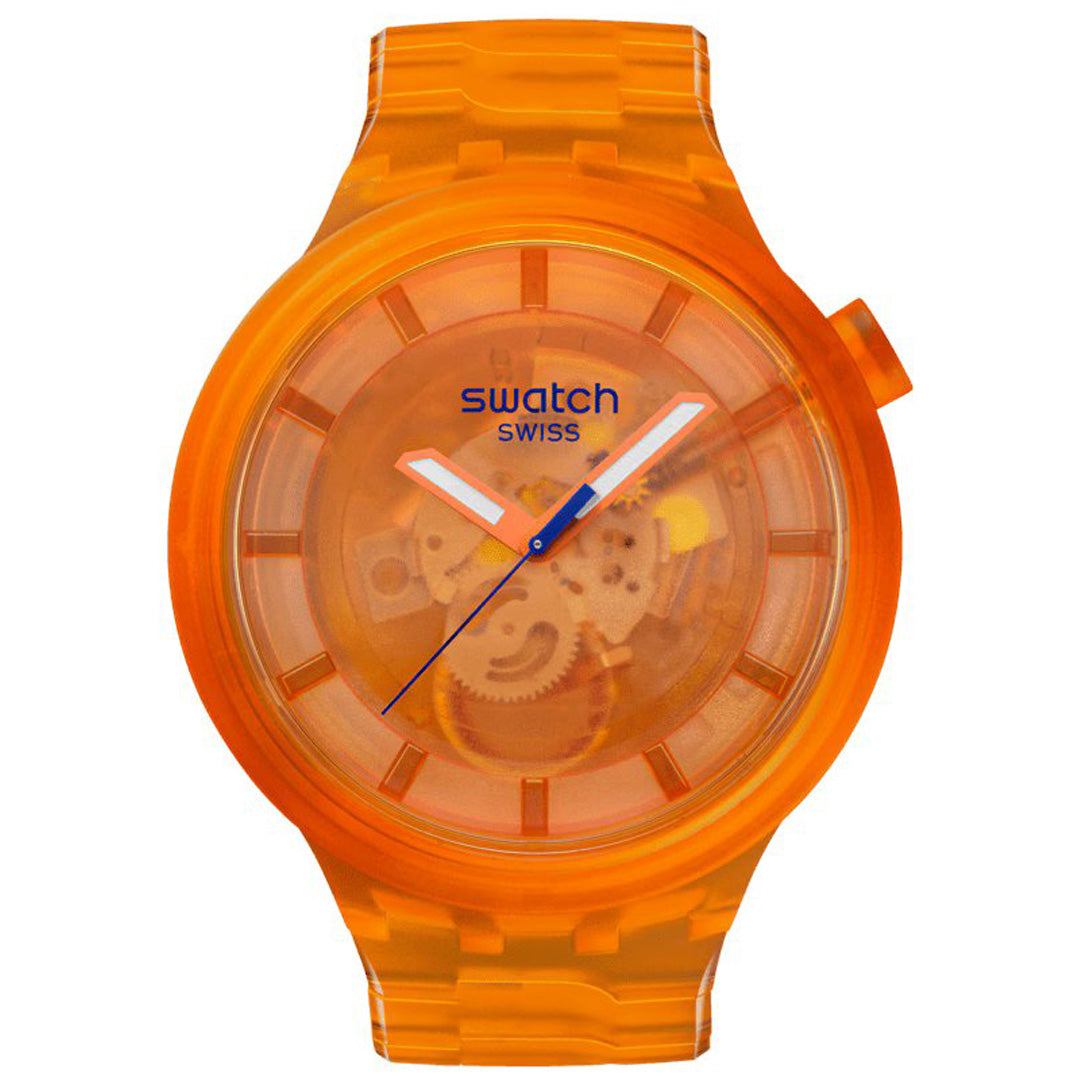 This oversize orange watch boasts an allover transparent look from its biosourced case, dial, and bezel to its biosourced bracelet with butterfly buckle. The transparent orange biosourced dial gives a view of the movement while orange hour and minute hands with glow in the dark and a contrasting blue seconds hand tell the time under the biosourced glass.