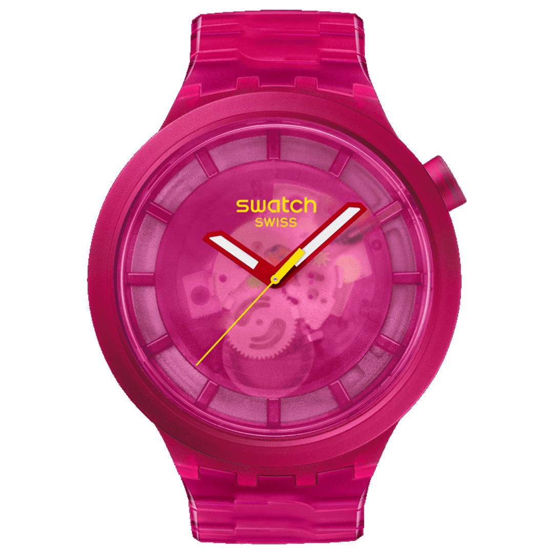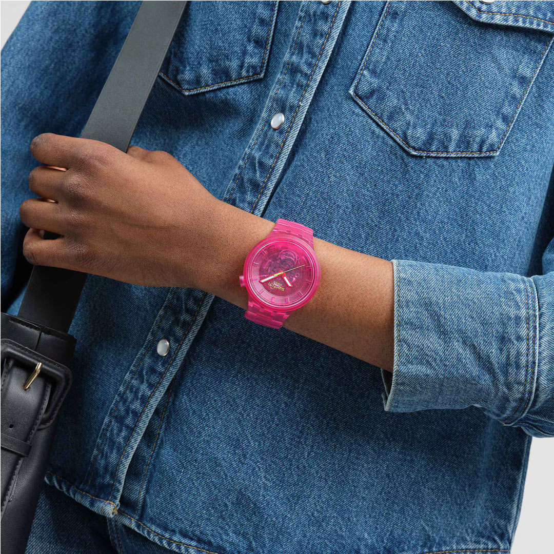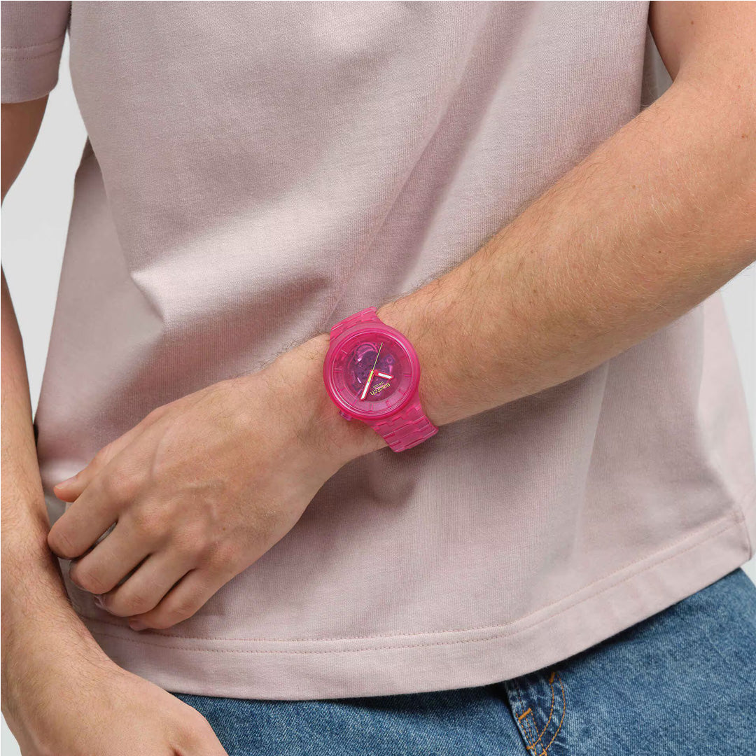 This oversize pink watch boasts an allover transparent look from its biosourced case, dial, and bezel to its biosourced bracelet with butterfly buckle. The transparent pink biosourced dial gives a view of the movement while pink hour and minute hands with glow in the dark and a contrasting yellow seconds hand tell the time under the biosourced glass.