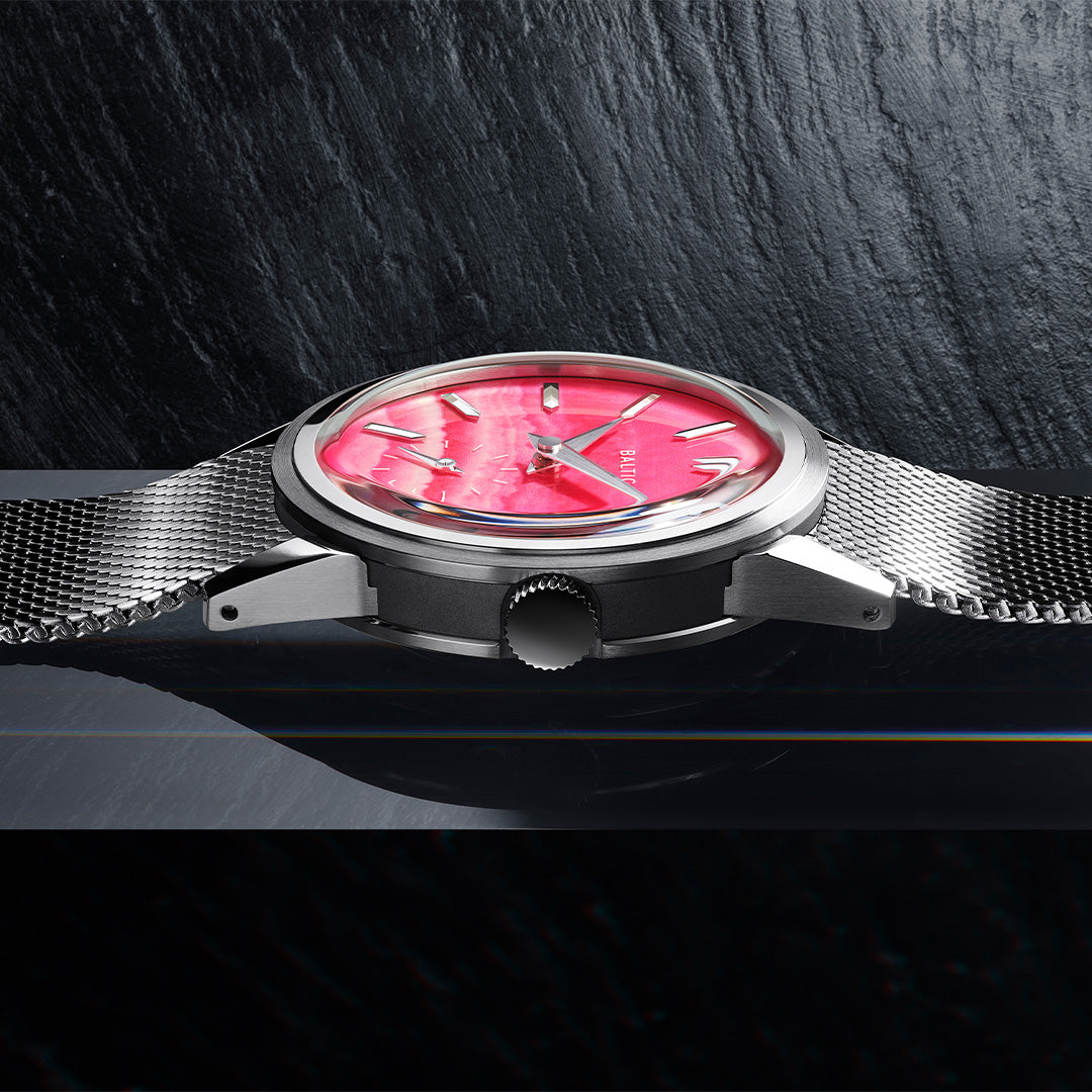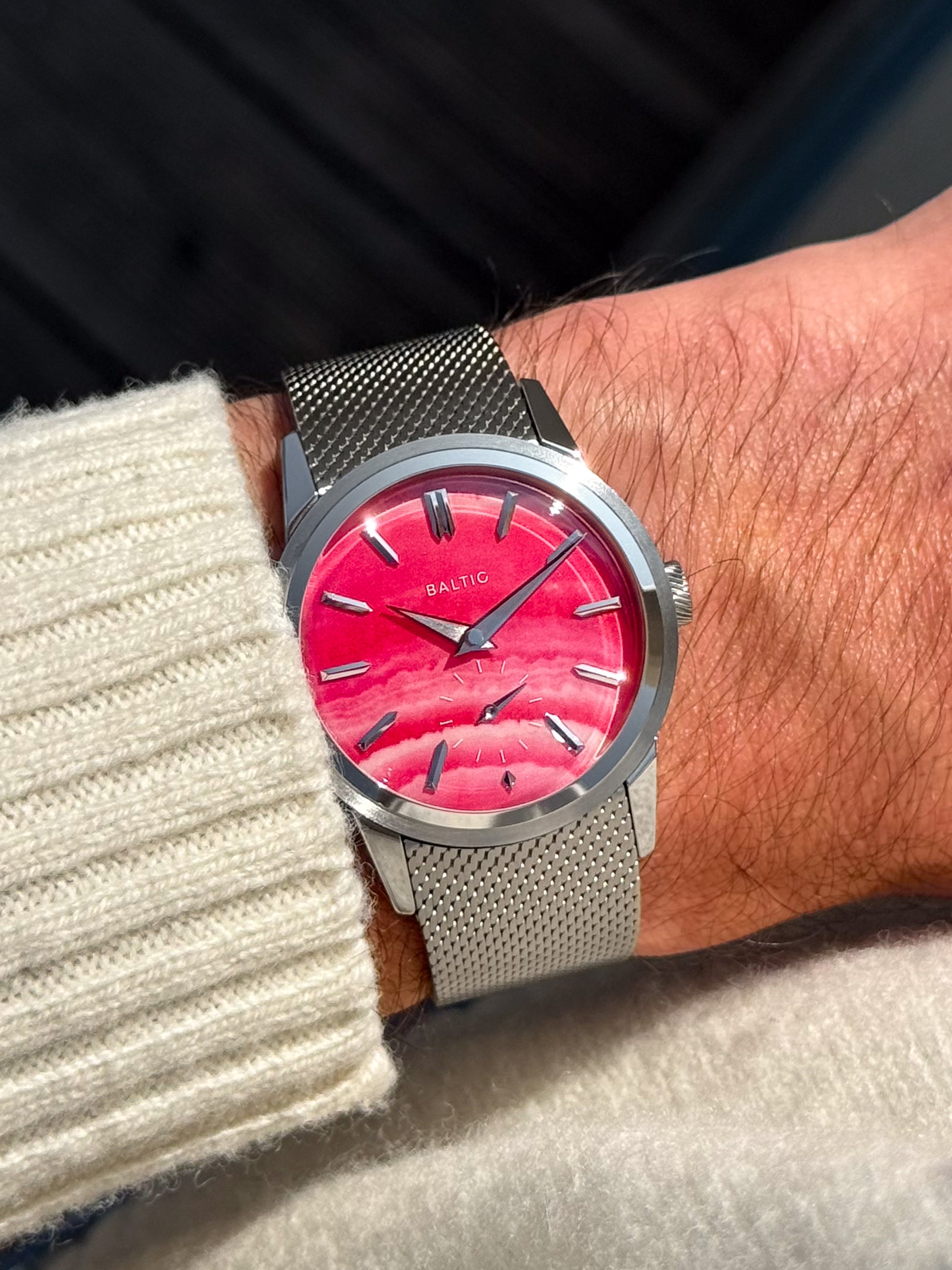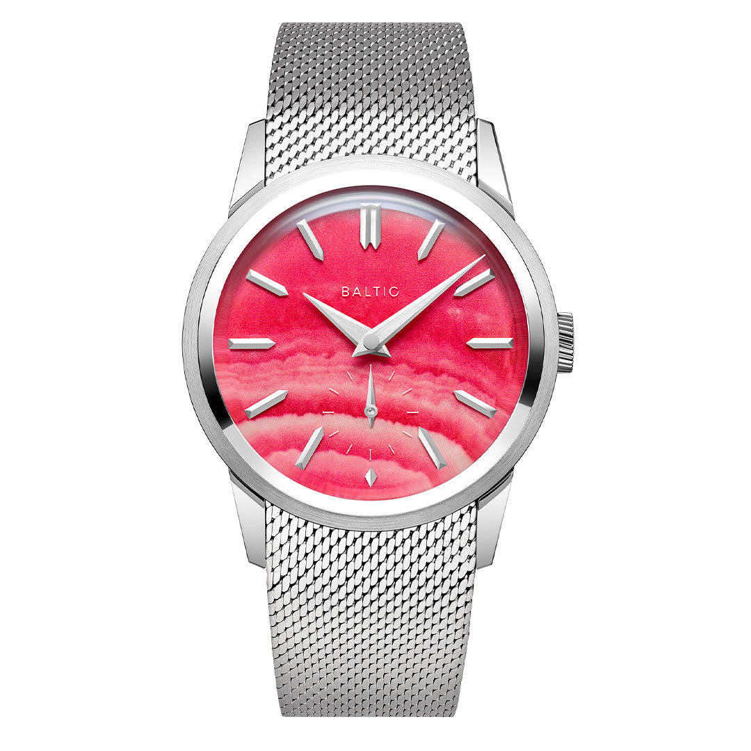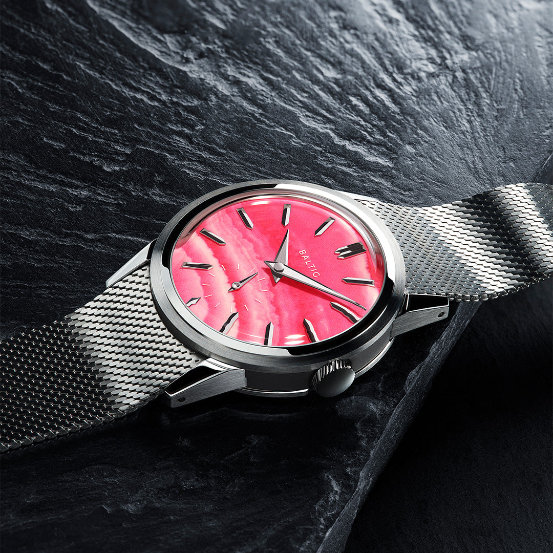 Dial: Pink Albite stone dial, Brushed dauphine hands with polished chamfers. Polished and applied indexes