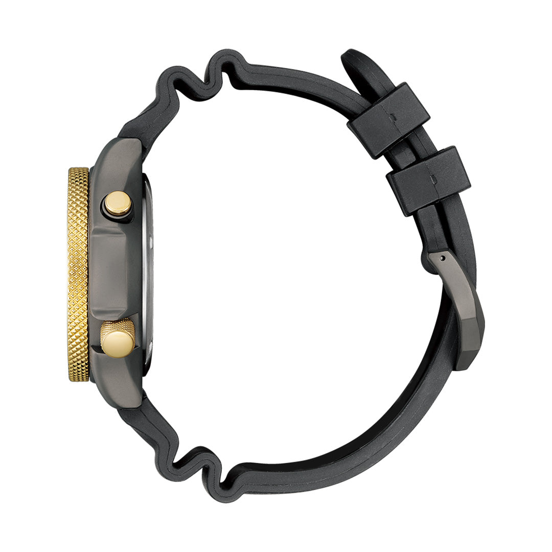 Gold-plated unidirectional bezel, crown, pushers, and depth sensor
