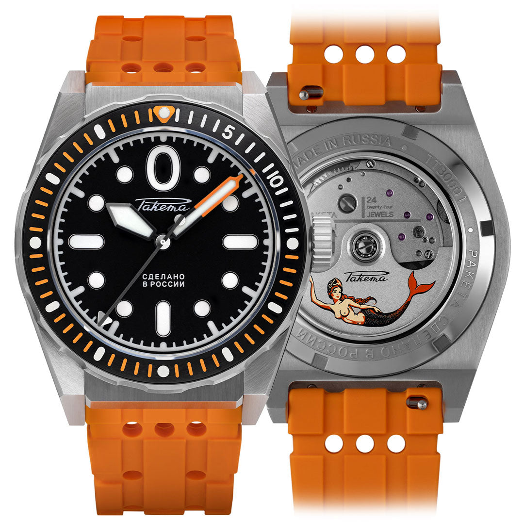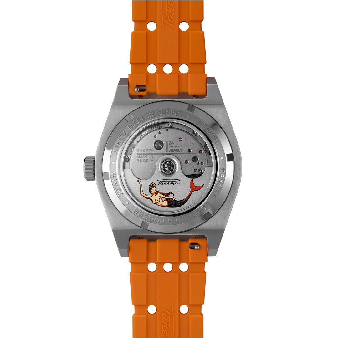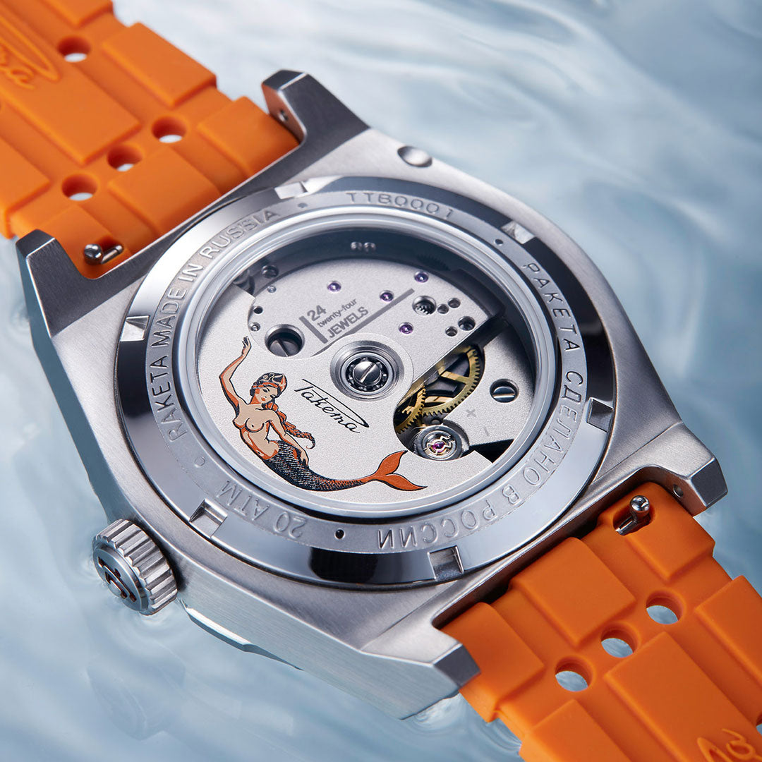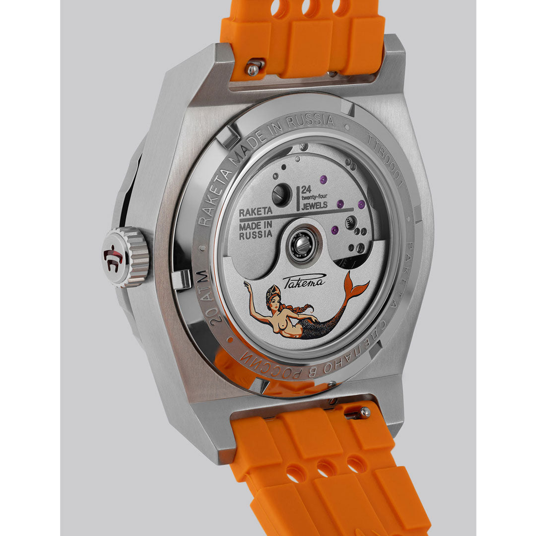 The heart of Raketa Amphibia is its automatic movement, manufactured from A to Z at the Raketa Watch Factory in St. Petersburg. The movement’s rotor is adorned with an image of a mermaid designed in the style of illustrations from Russian fairy tales. It reminds every diver of his secret dream — to encounter a beautiful mermaid under the sea.
