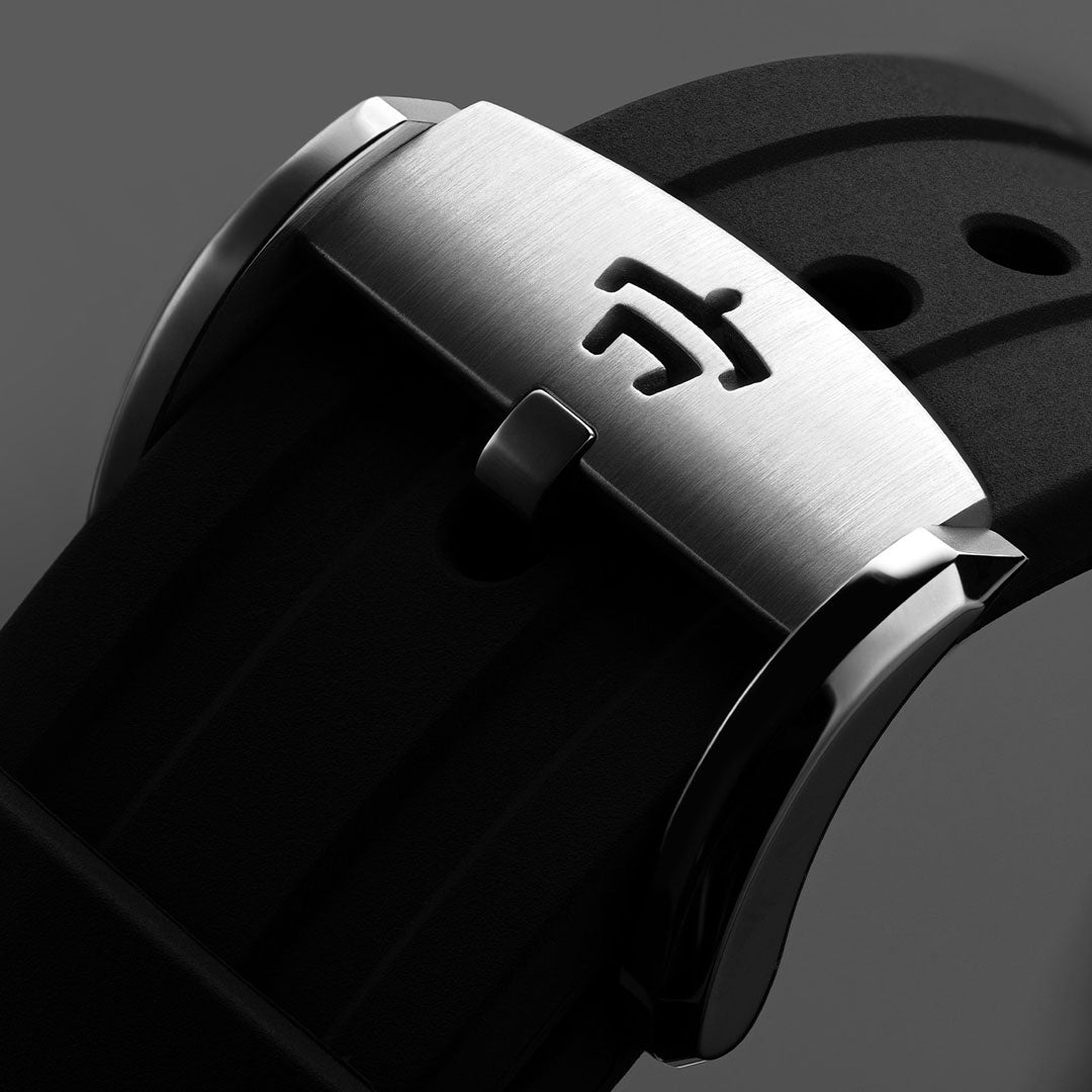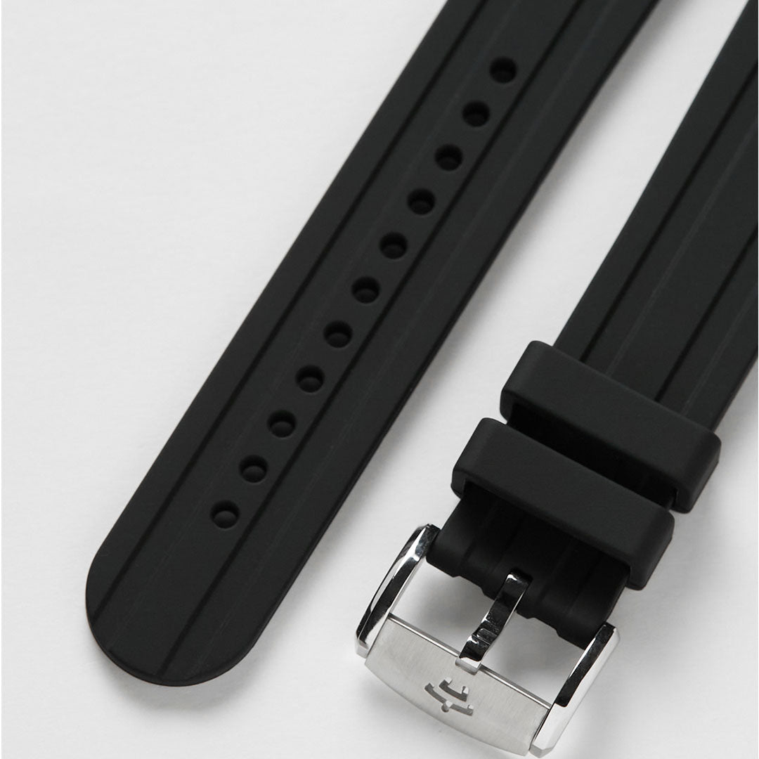 Its brightly colored silicone strap is crafted for comfort in aquatic environments: with its full-length perforations, you may adjust the size for a snug fit with your wetsuit and prevent water build-up beneath the strap. A second strap in black silicone is included, and swapping is easy with a quick-release system.