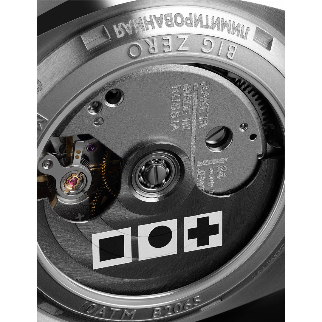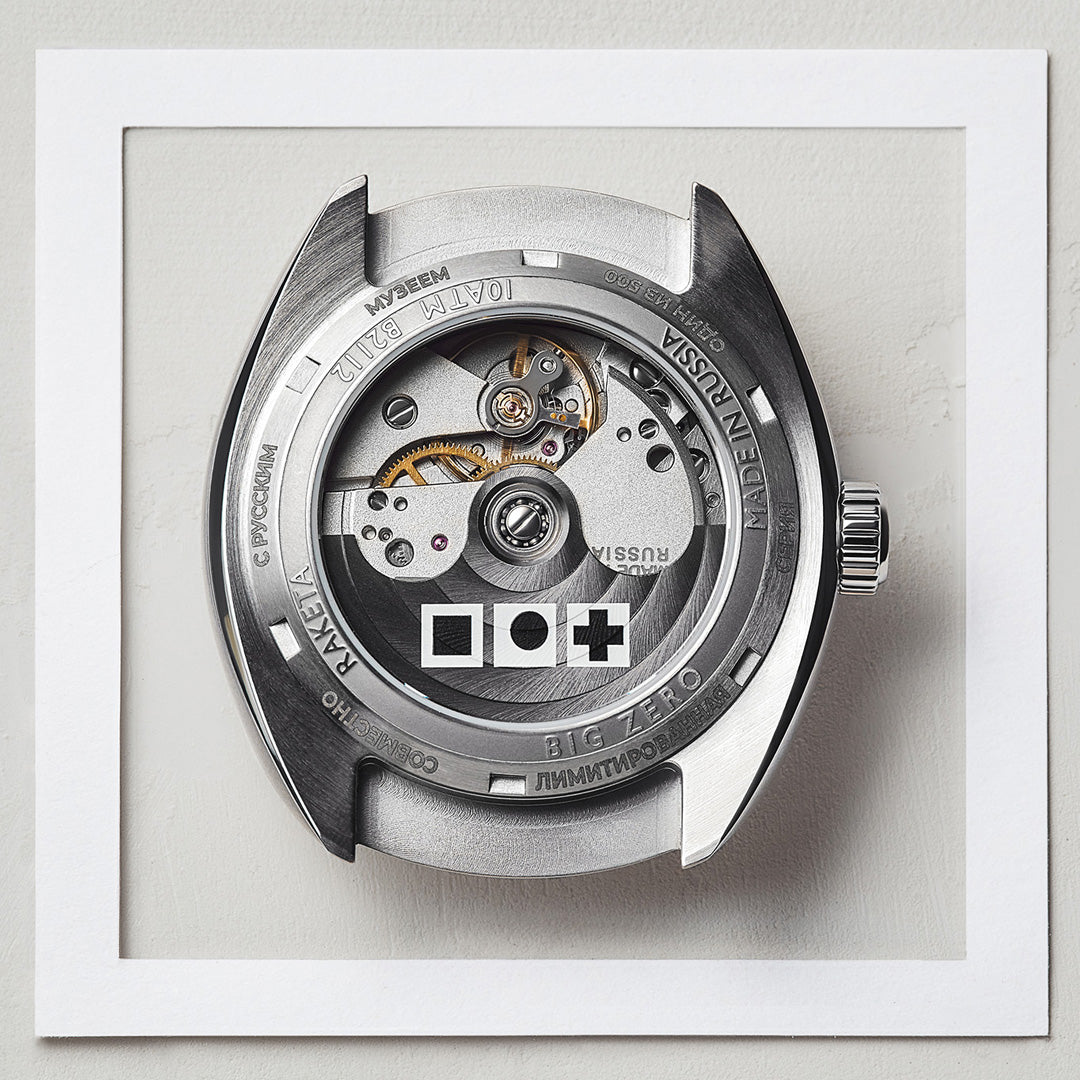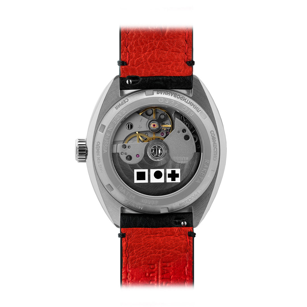 The mechanical movement of the watch is produced from A to Z at the Raketa Watch Factory in St. Petersburg and expertly decorated by the Factory’s masters. Malevich’s entire geometric cycle is printed on the oscillating weight.