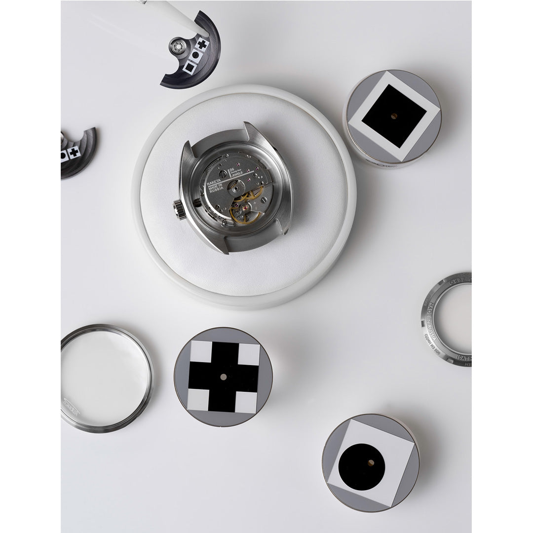 According to Malevich’s concept, the cross is the most complex form of the cycle. Due to its vertical and horizontal lines, the cross connects active and passive elements, embodying the unity of spiritual and earthly principles. Malevich regarded the simple geometric shape of a cross — along with a square and a circle, — as a traditional symbol of the Universe. It therefore also refers to Raketa’s DNA which is directly linked to the Cosmos and its representation in art.