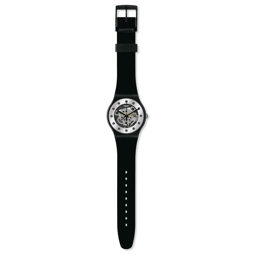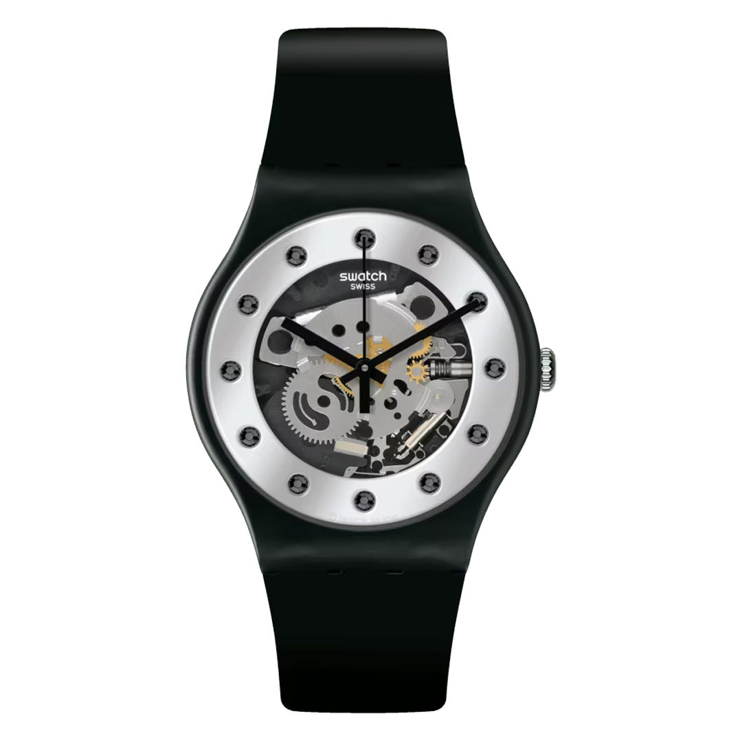 SILVER GLAM IN BIOSOURCED offers a fascinating view of its movement through a cut-away window at the center of the biosourced glass dial. A solid matte black biosourced material case sits on the matte black and red silicone strap of this watch with elegant silver-colored parts and clear crystals.
