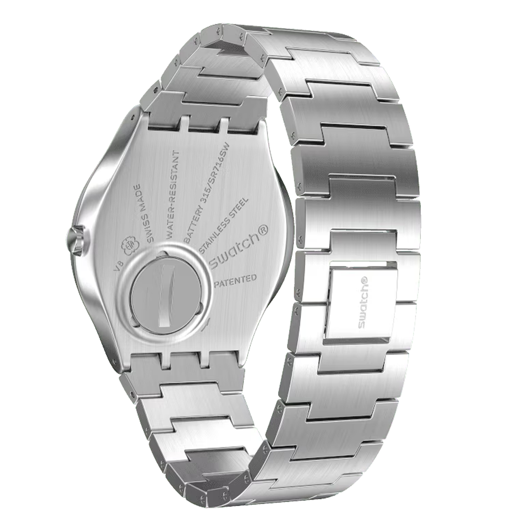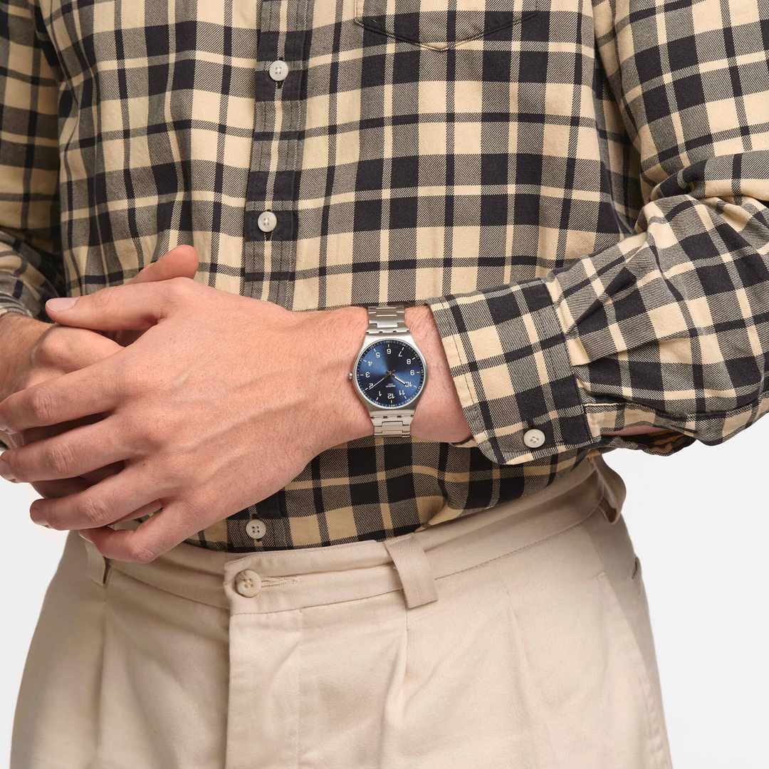 Super thin SKIN SUIT BLUE (SS07S106G) features a slim brushed metal bracelet and matching case. The sun-brushed blue dial has silvery hands coated in Swatch Glow.