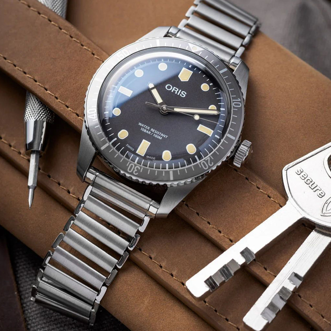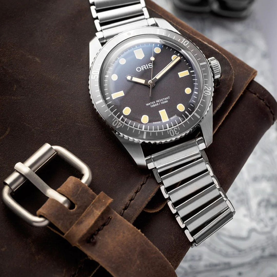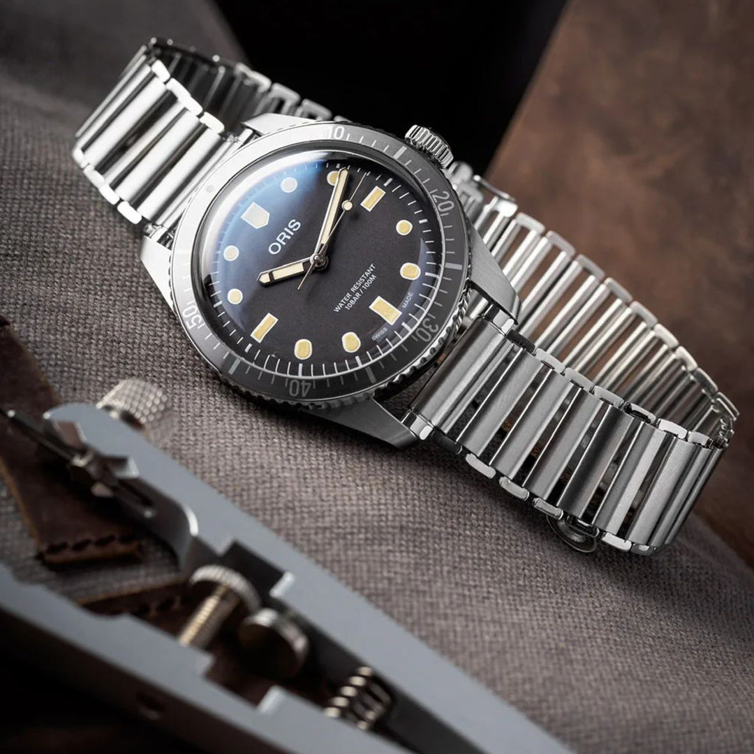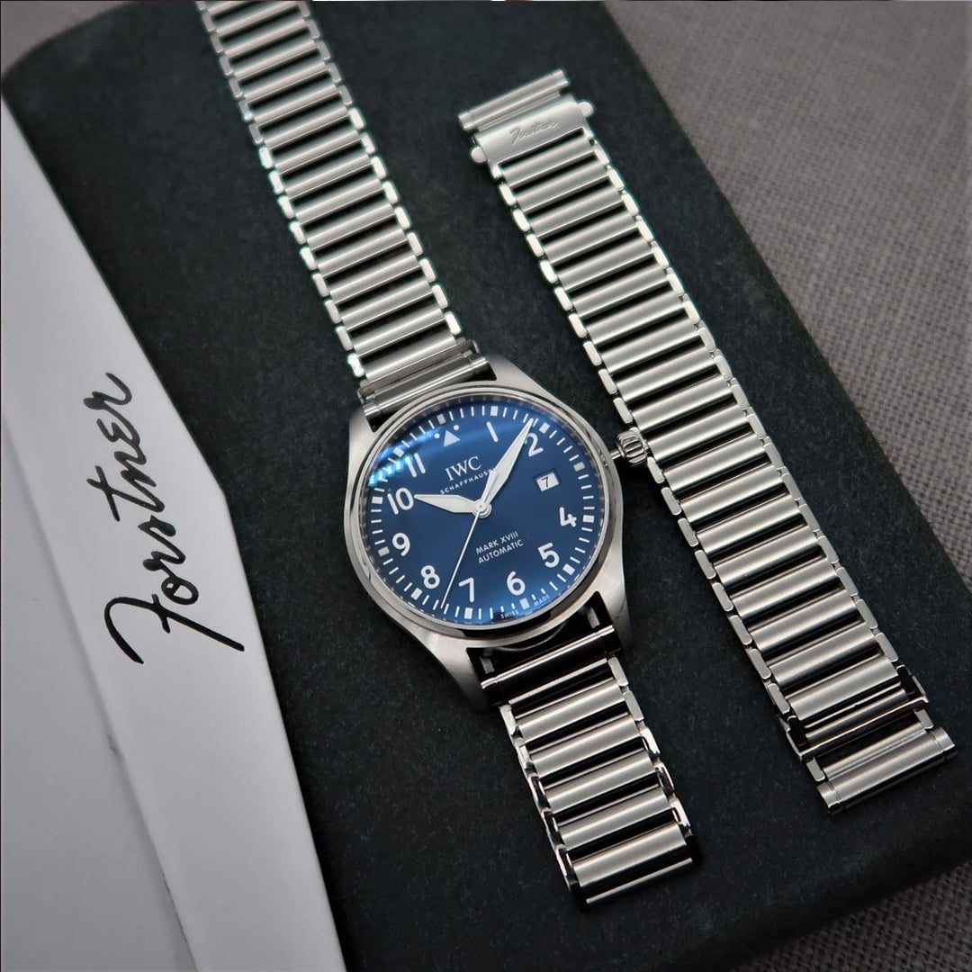 The Forstner Klip brings back one of the most popular bands in Forstner's historic catalog. The present bonklip-style bracelet has an 18mm wide central portion, with alternating brushed and polished finishes on the rectangular "ladder" design, and a polished spring-loaded clasp. Made entirely of stainless steel, the band is light, breathable, and extremely comfortable, having the ability to be easily sized in approximately 3mm increments for the perfect fit.