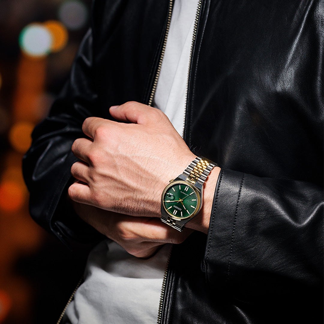 The sunray dial, available in several color, features applied indices with luminous inserts, a magnified date display at 3 o’clock, and a clean, balanced layout. Sapphire crystal protection enhances durability, while the integrated three-link steel bracelet delivers a substantial, comfortable fit on the wrist.