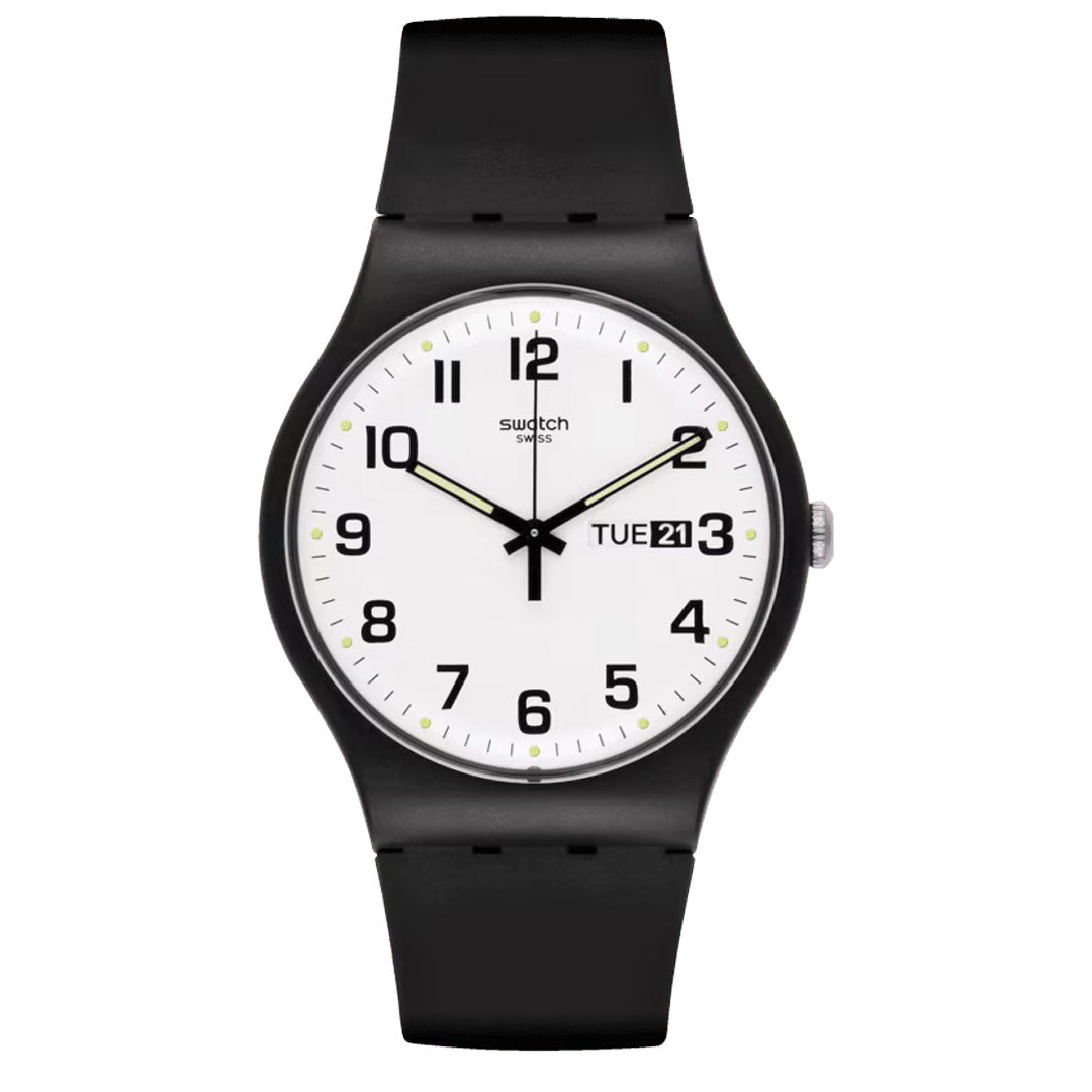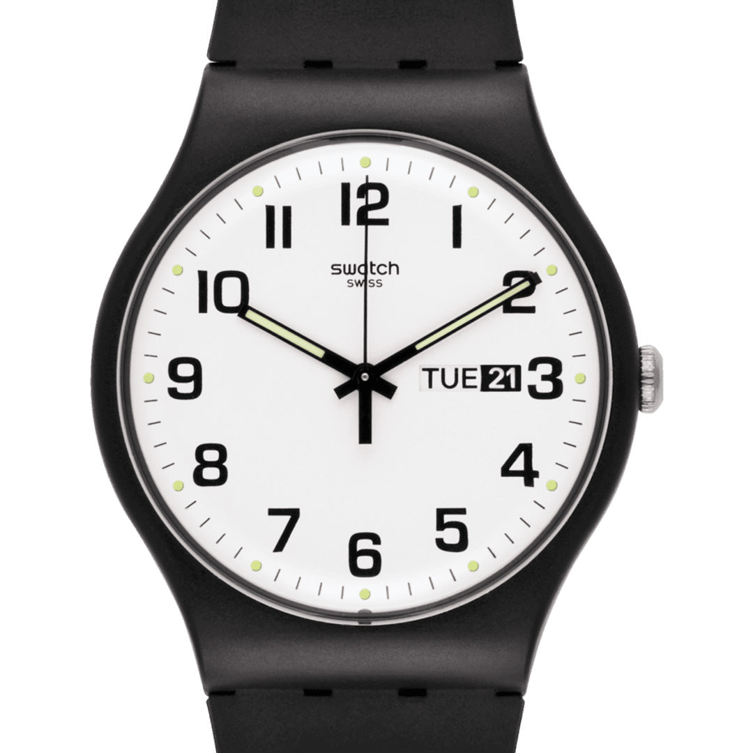 TWICE AGAIN reminds us that there’s a first time for everything and once isn’t enough. The minimalistic watch has a black biosourced strap and day and date windows on the white dial.