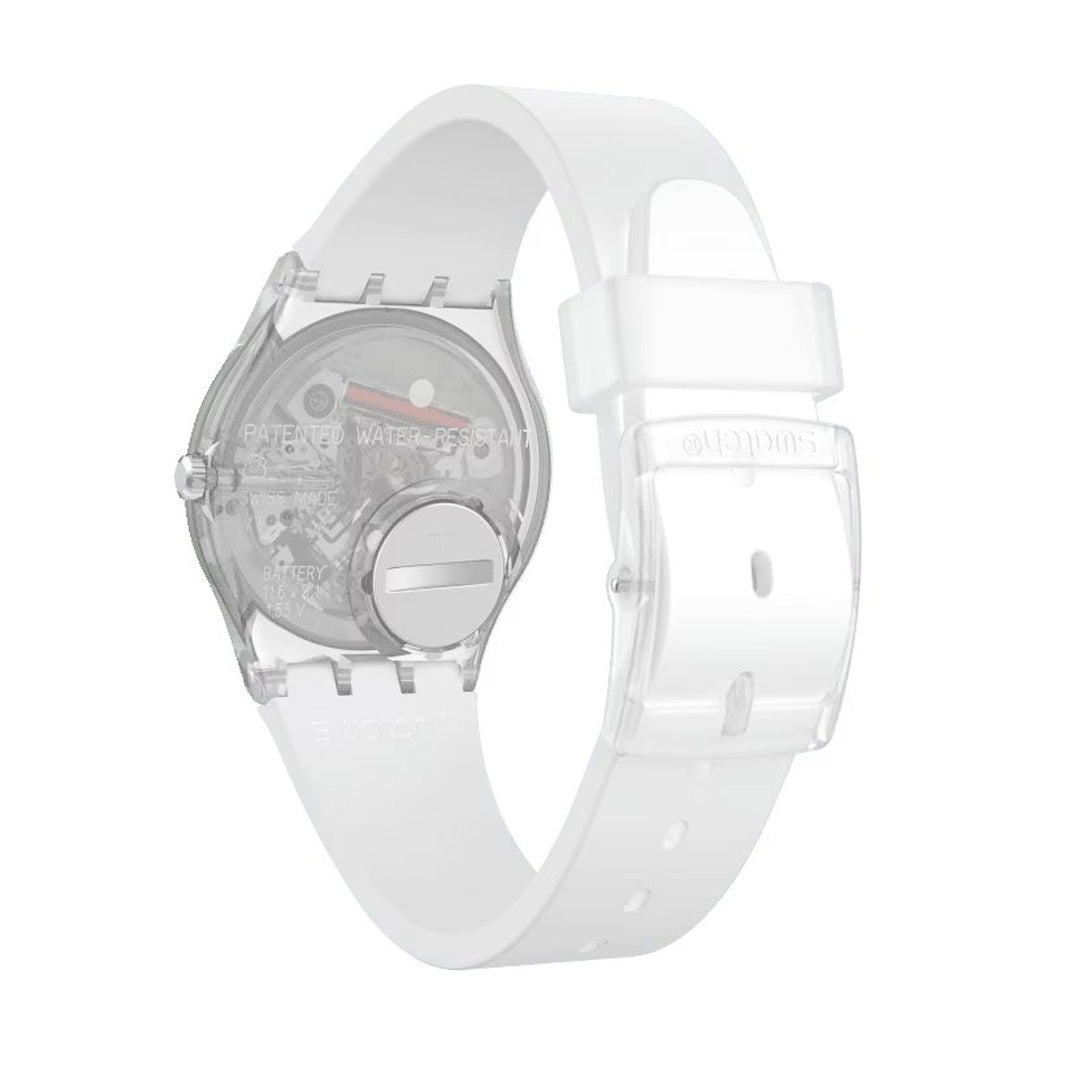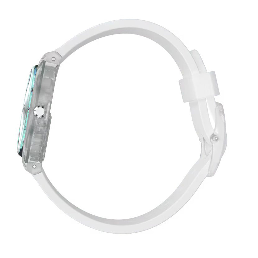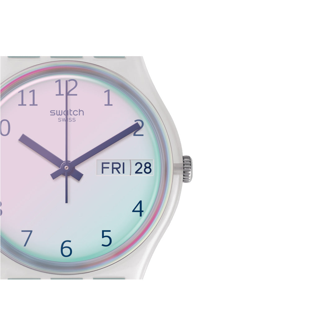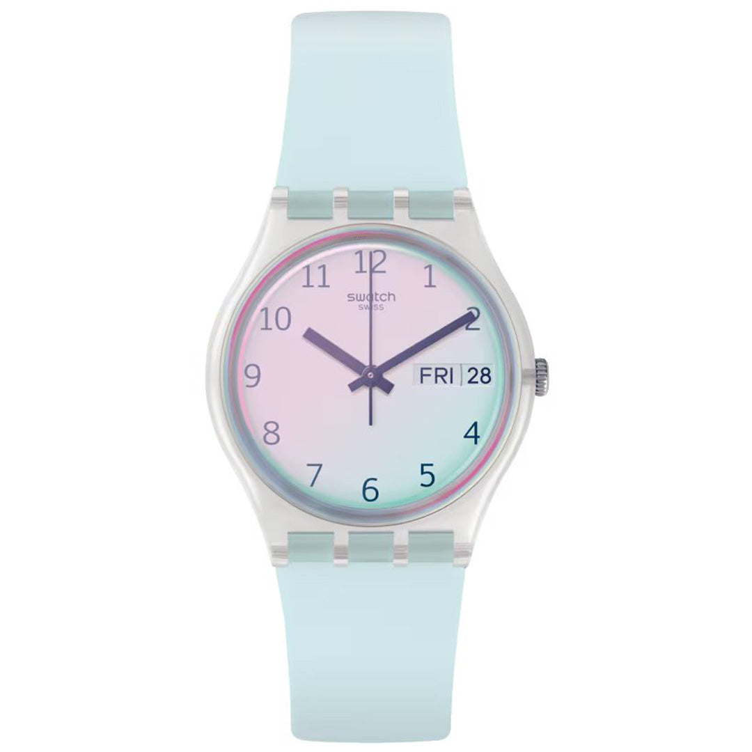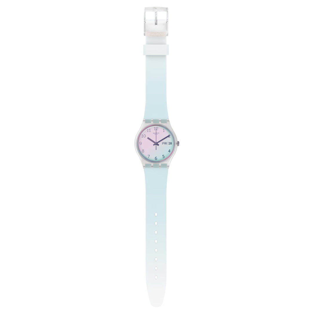 Sky blue ULTRACIEL (GE713) blows the clouds away. The light blue strap goes perfectly with the white dial, which is covered by a light blue Swatch Solar Spectrum glass.