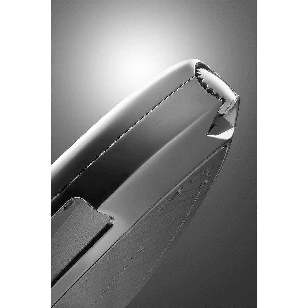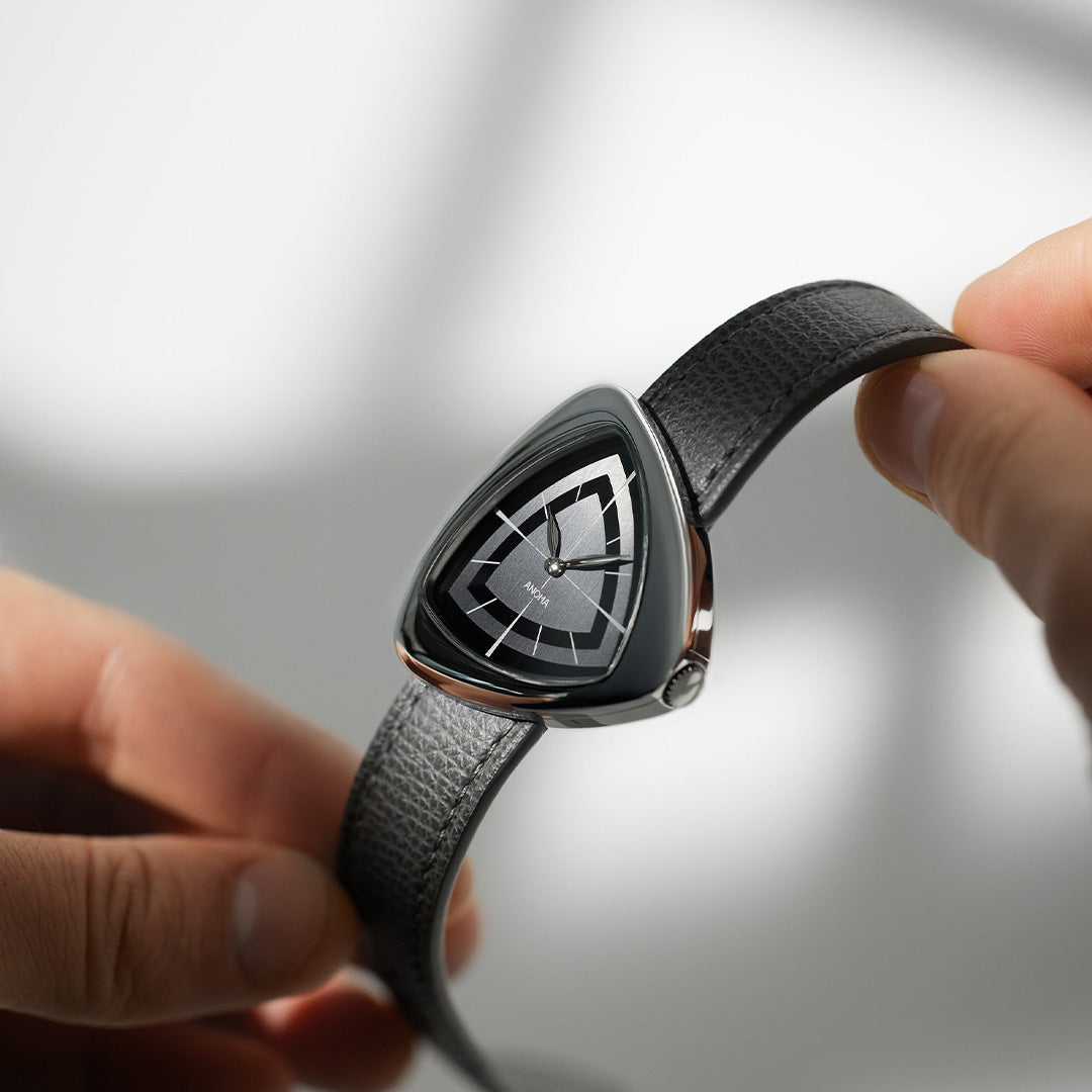 The dial begins with a vertically brushed base, followed by the engraving of contrasting triangles. Finally, three layers of black lacquer are applied on top. This creates a surface that shifts between smooth gloss and sharp two-tone contrast, inviting continual rediscovery.