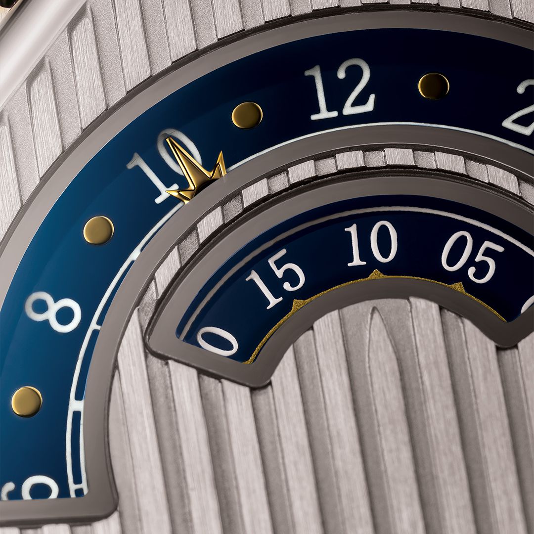 Both displays follow a principle of moderation, in line with the quiet luxury shaping contemporary watchmaking: minutes are shown in five-minute increments; hours appear as even numerals, separated by applied dot markers and framed by a subtle sector-style outline — a nod to classical codes.