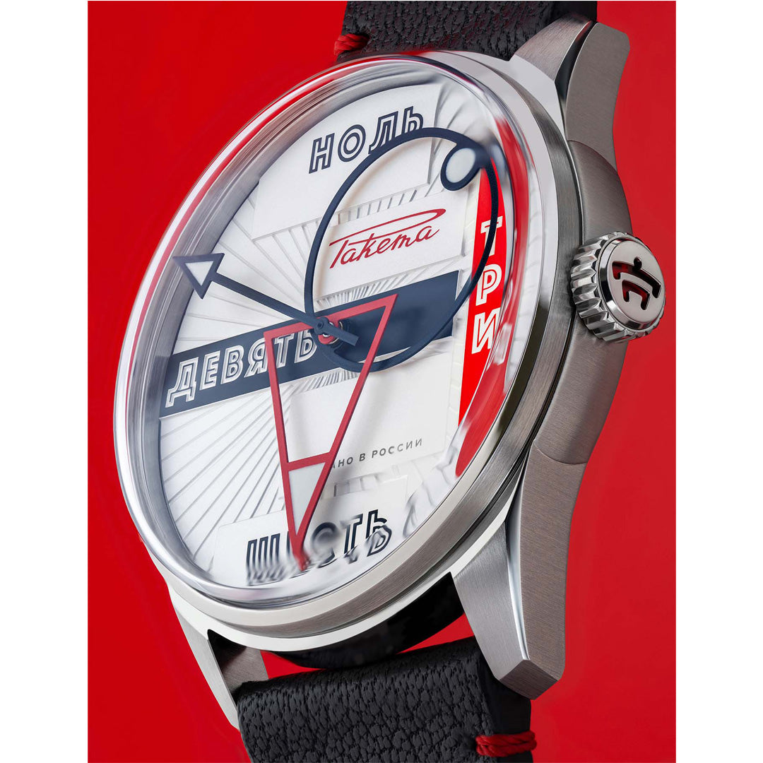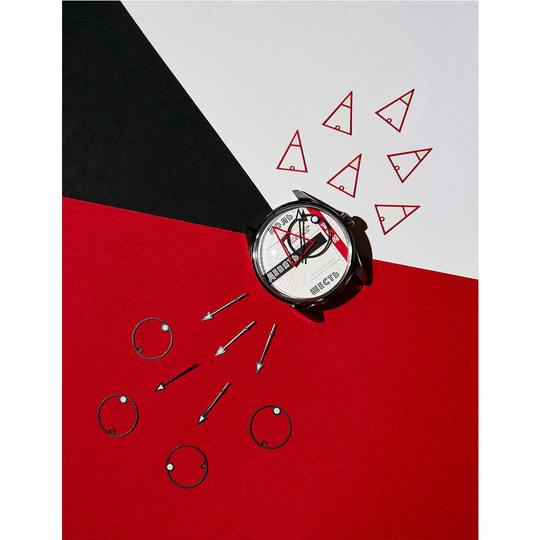 The abstract geometrical shapes on the dial are set in motion by a Raketa automatic movement designed and manufactured at the Raketa Watch Factory in St. Petersburg. Looking through the transparent case back, you can appreciate the beauty of the movement and enjoy its harmonious work.