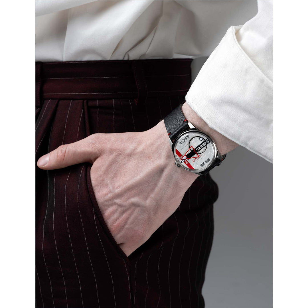 Three main avant-garde colours – red, white, and black – combined with the austere geometry of hands and fonts help emphasise the beauty and uniqueness of each moment. Even a quick glance at your wrist will remind you of this, revealing each time a new art composition on the dial.