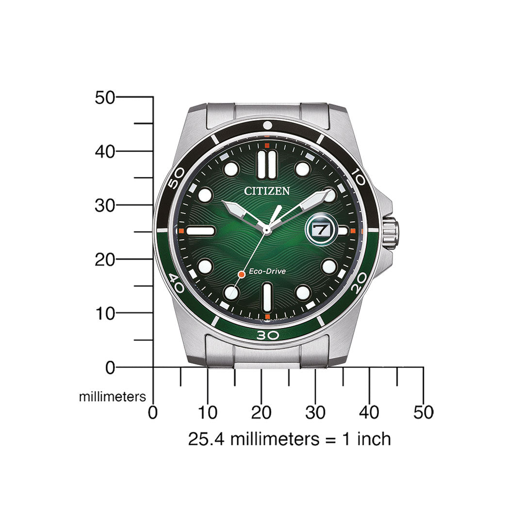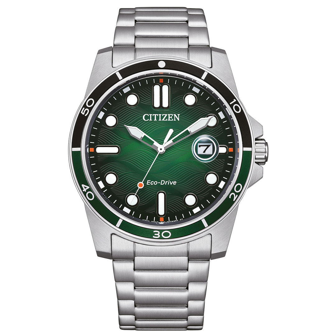 The sporty three-hand watch AW1811-82X with a marine design impresses with a stainless steel case and bracelet, crystal glass and a green dial with a fine wavy structure. The illuminated hands and indices are giving the watch an of optimum readability.