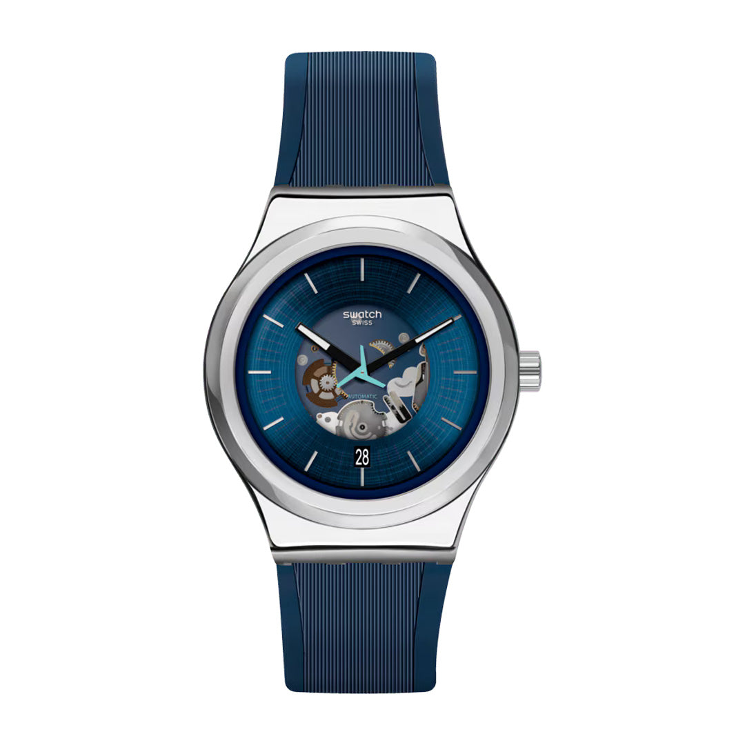 Revealing the magic of the most recent revolutionary innovation in watchmaking, created by Swatch in 2013. SISTEM51 is not only amazing in technical terms (51 components and only 1 screw for a mechanical watch – never seen before!): it is also a beauty to look at. Familiar with the see through watchcase back, where the decorated movement can be appreciated and the secret of magic of the transparent oscillating weight can be discovered? Now also the front of the watch unveils its secrets – and the lovers of details will enjoy the three-winged seconds’ hand, previously spotted only on the iconic and very limited SISTEM51 Flymagic, here in an irreverent dynamic turquoise blue color. Be it the navy blue and shiny stainless steel, for the city style maker, or in full grey with cool matt finish for the lovers of adventurous nightlife, the Nivachron spiral allows for highest possible resistance to magnetic fields, making these the most precise companions, ready to resist any shock and any strong emotion.
