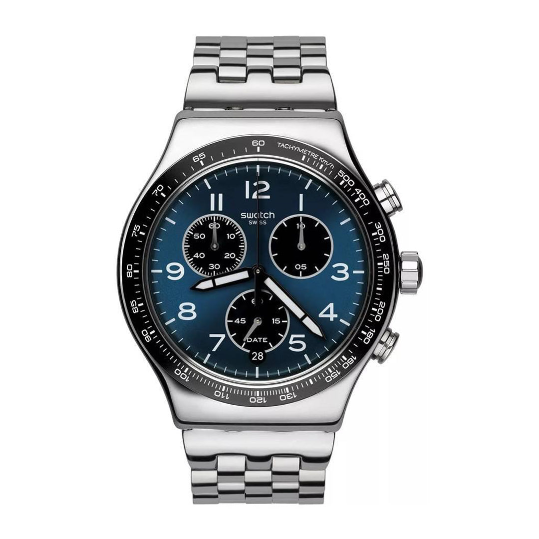 A timeless design for the man on the go, the BOXENGASSE (YVS423GC) watch features a sun-brushed blue dial with white Arabic numerals, silver and white prints, three counters and a date window at 6 o'clock. This sophisticated style is set apart with a polished stainless steel case and a black bezel. A polished stainless steel strap with a traditional link pattern completes the design.