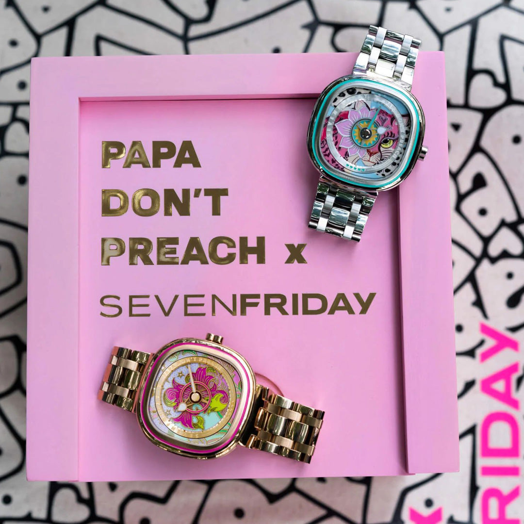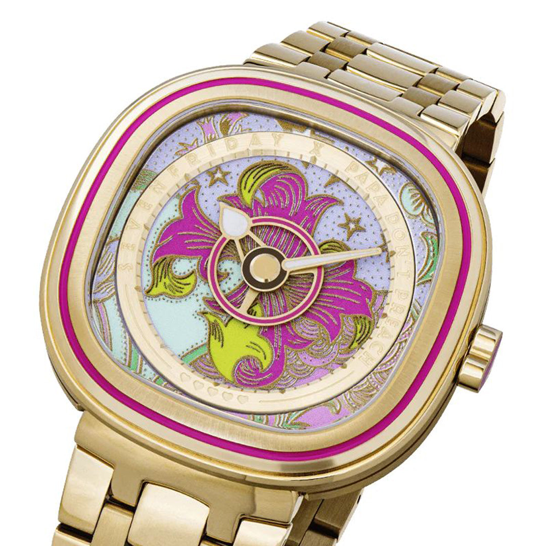 Dial: Three layers construction. Dial displaying an Indian flower décor, exclusively designed by PDP for SEVENFRIDAY. Applied dial ring in galvanic gold, engraved SEVENFRIDAY X PAPA DON`T PREACH highlighting the official collaboration