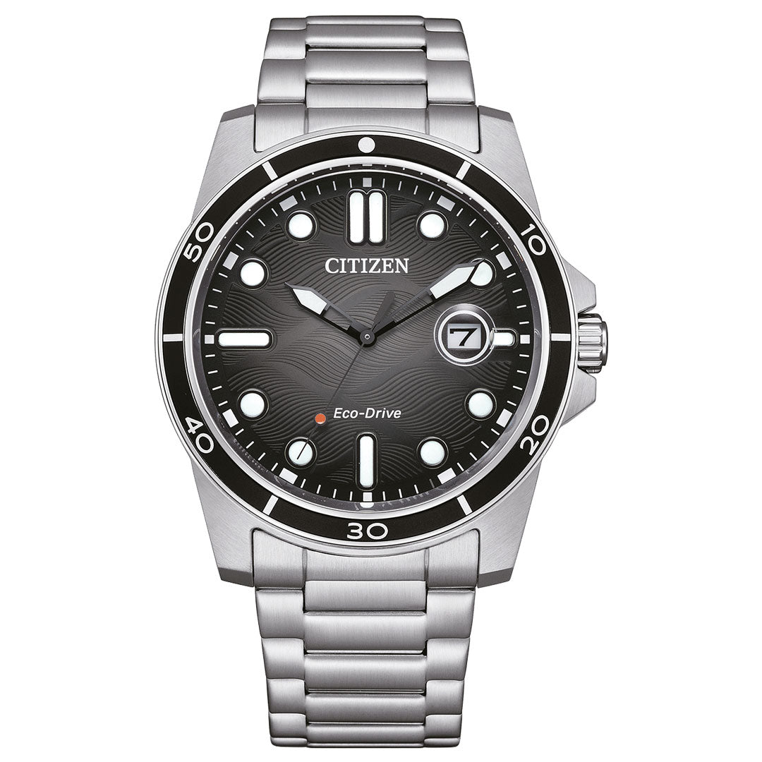 The sporty three-hand watch AW1816-89E with a marine design impresses with a stainless steel case and bracelet, crystal glass and a black dial with a fine wavy structure. The illuminated hands and indices are giving the watch an of optimum readability.