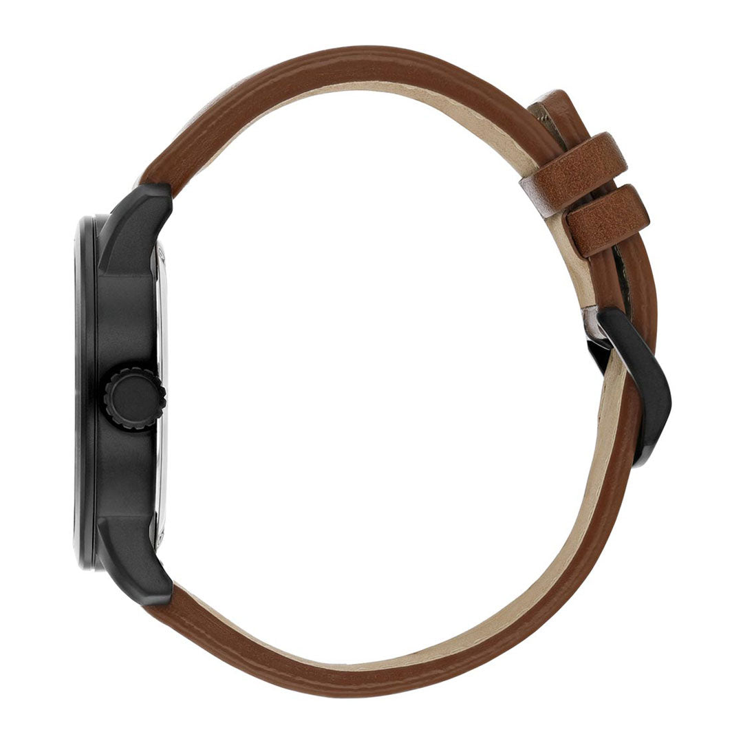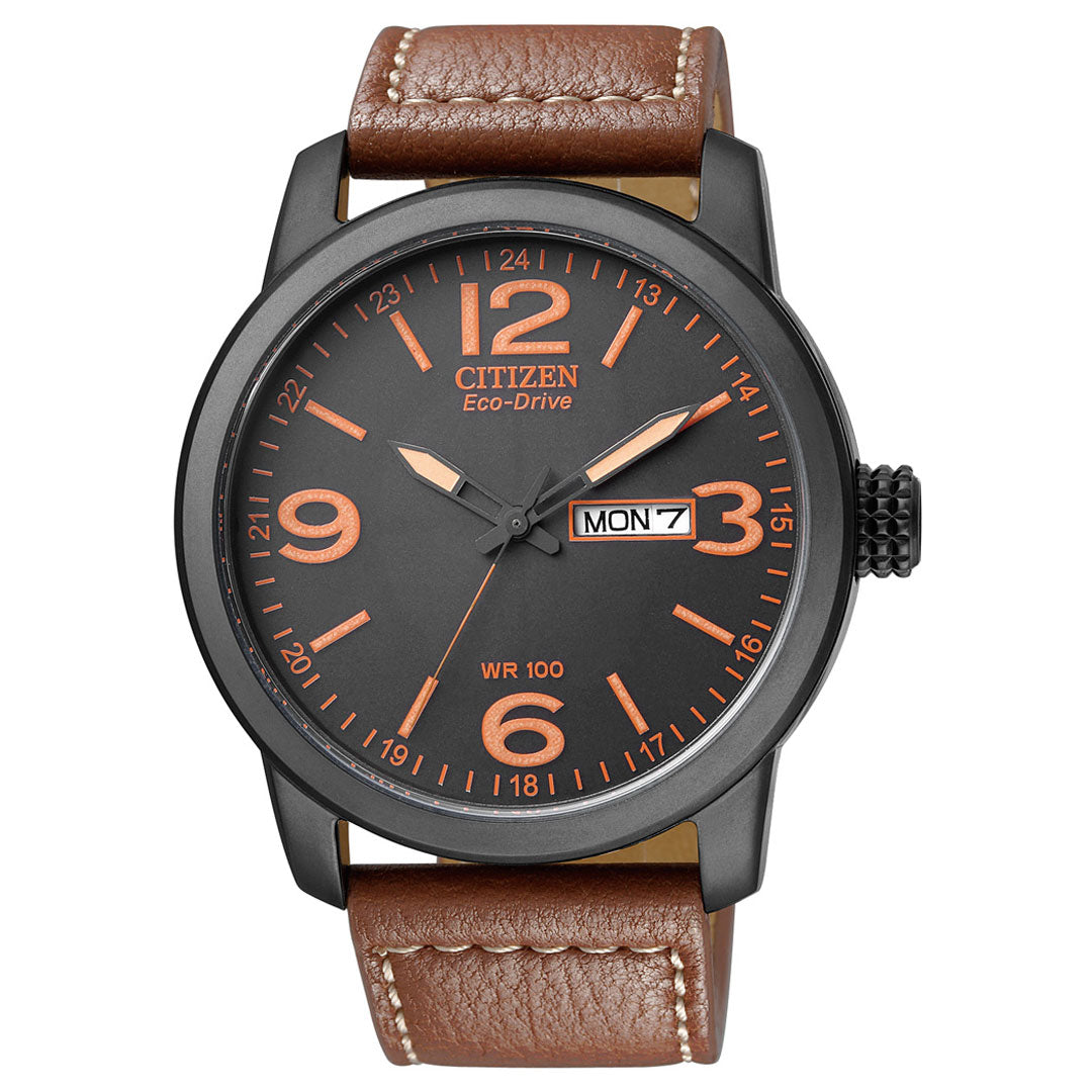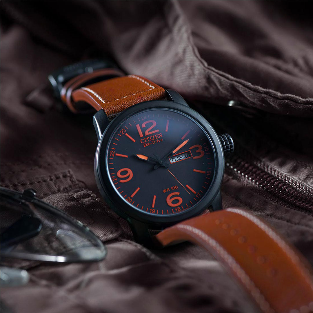 The rugged design of this military-inspired watch is guaranteed to get you noticed. Key features include day-date, luminous hour and minute hands and 100 meter water resistance. Additional details include Stainless steel black ion-plating, a smoky black dial with eye-popping orange numerals, and a handsome leather strap come together dramatically in this rugged yet stylish timepiece with 42mm screw-back case. Powered by Eco-Drive- the revolutionary light powered movement from Citizen, this watch has the ability to continuously recharge in any light source and can run for a minimum of six months even in the dark without any charge. This revolutionary earth-friendly technology eliminates the need to change battery frequently and gives you hassle-free timekeeping, never disappointing you when you need it the most. The Eco-Drive movement also come with built-in Insufficient Charge Warning Function and Overcharge Prevention Function.
