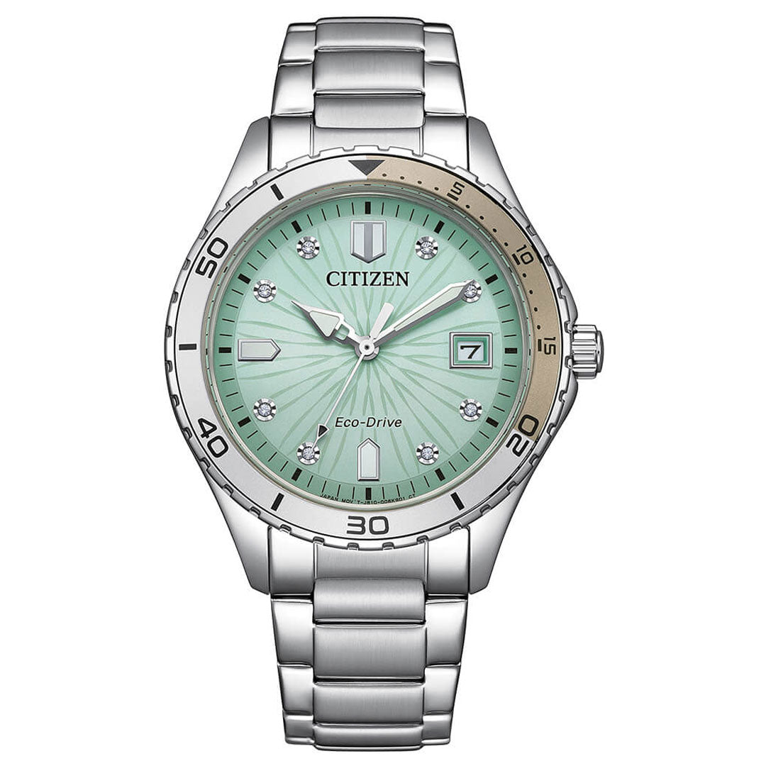 Introducing the new timepiece for woman, a resplendent member of the Eco-Drive Women's collection that marries sophisticated technology with enchanting aesthetics. This watch is encased in stainless steel, measuring 36.8mm in diameter, and is designed to complement the elegance of its wearer gracefully.The dial of this exquisite watch is a soothing pastel green, offering a fresh and vibrant look that is both eye-catching and graceful. Each hour is marked not just by functional indices but is also adorned with sparkling crystals that add a touch of glamour and luxury. This brilliant design is underpinned by Citizen's Eco-Drive technology, which powers the watch by any light source, ensuring that the watch continues to function without the need for a battery replacement.The robust stainless steel bracelet features a fold-over clasp with a push button, offering a secure fit that combines comfort and convenience. The mineral glass covering the dial provides durability and clarity, protecting the beautiful face of the watch from everyday wear and tear.Water-resistant up to 10 bar and equipped with an 8-month power reserve, this watch is as functional as it is beautiful. Additional features like a date display and Eco-Drive technology ensure that this watch is not only a stunning accessory but also a reliable tool for timekeeping. This timepiece is perfect for those who seek a watch that balances the demands of daily life with the desire for a touch of elegance.