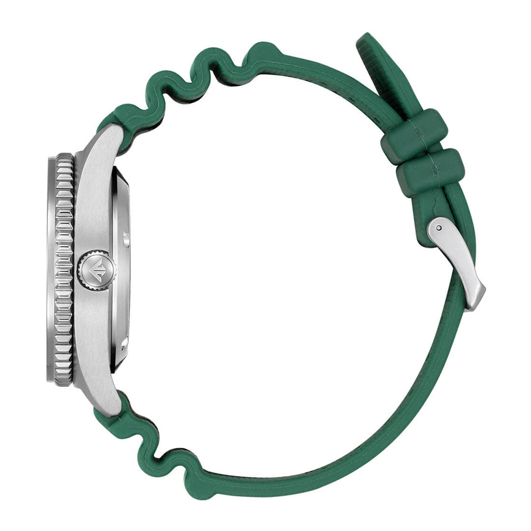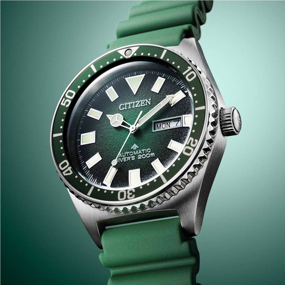 Dive into reliability and precision with the new Citizen Promaster Marine Automatic, a robust timepiece designed for the adventurous man. Built with a 41mm stainless steel case, it offers durability along with a sporty elegance that stands out both under the sea and on land. This watch features an automatic movement, eliminating the need for a battery and offering an impressive 42-hour power reserve. Perfect for divers and water sports enthusiasts, it provides a water resistance of up to 200 meters, ensuring performance in deep waters. The dial is both functional and stylish, set with luminescent hands and markers for clear visibility in low light conditions. The day and date display keeps you on track, while the unidirectional rotating bezel allows for easy monitoring of dive times or other measurements. The watch is fitted with a comfortable and resilient green polyurethane strap with a standard buckle, ensuring a secure fit for any adventure. A mineral dual sphere glass covers the dial, providing high resistance to scratches and impacts. Sporting a sophisticated, gradient green dial, this Divers Automatic is not just a tool watch but also a statement piece that speaks to the wearer's rugged sophistication. This Citizen Promaster Marine Automatic comes with a 3-year regional warranty plus an additional 1-year international warranty. Whether navigating the depths of the ocean or the urban jungle, this timepiece is your reliable partner for every journey.
