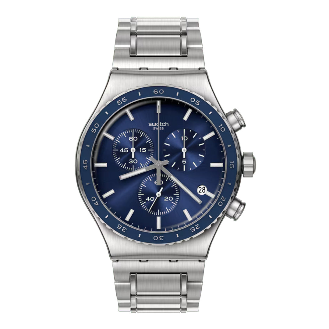 With its adjustable bracelet and butterfly buckle, this stainless-steel NEW IRONY CHRONO watch features a sophisticated dark blue face and engraved bezel in a brushed stainless-steel watch case with polished details.