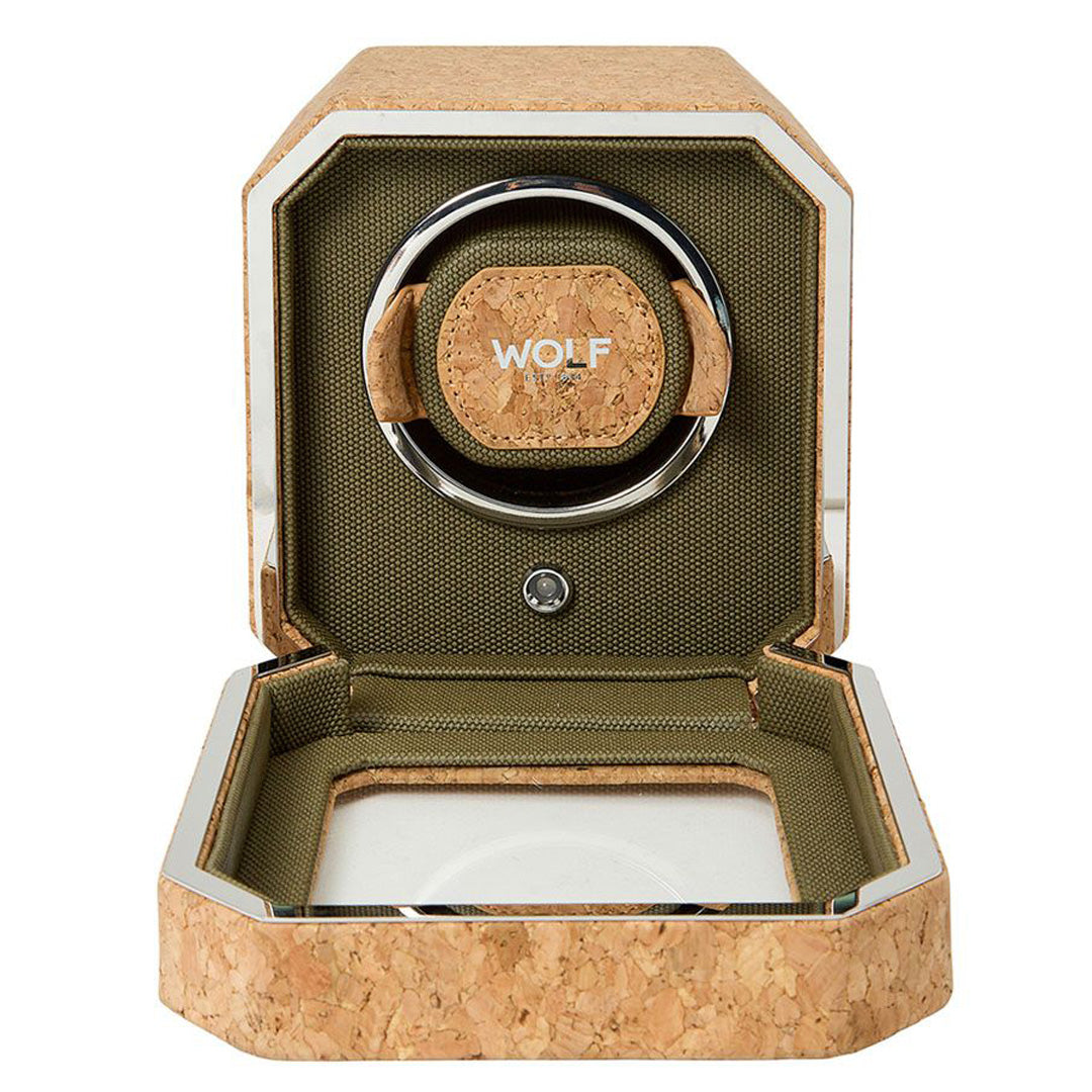 The Cortiça Single Watch Winder has a hexagonal shape with smooth edges and a khaki green interior giving it a unique and natural style. Hand made from sustainably grown Portuguese cork.