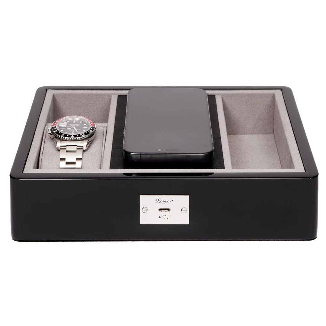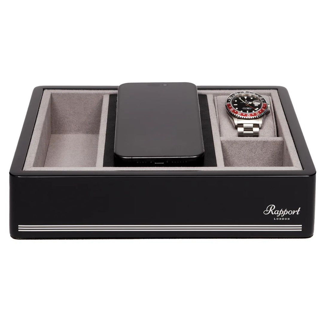 Crafted by experts, this multi-compartment tray promises to keep your bedroom or office organised. The QI-certified, wireless charging tray in a sleek lacquered grey features a leather covered area for your phone which allows for easy and intuitive charging. The interior is lined in a smooth material and has space for one watch and accessories.