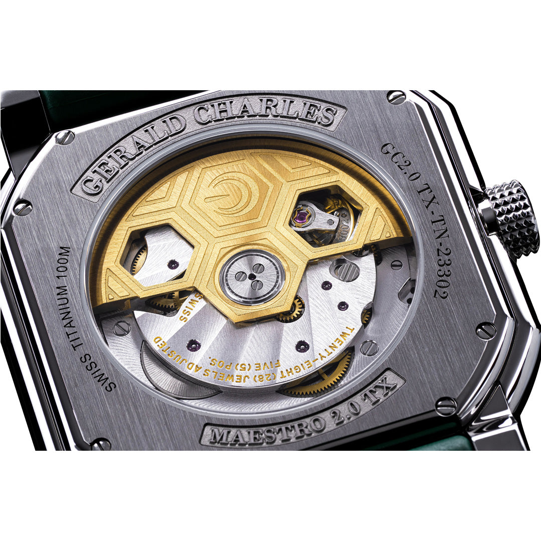 In keeping with the values of "Artistic Creativity and Technical Mastery", the hand-finished caliber has been rotated by 180° to allow the crown to be placed on the left of the Maestro Case and avoid rubbing while playing sport.