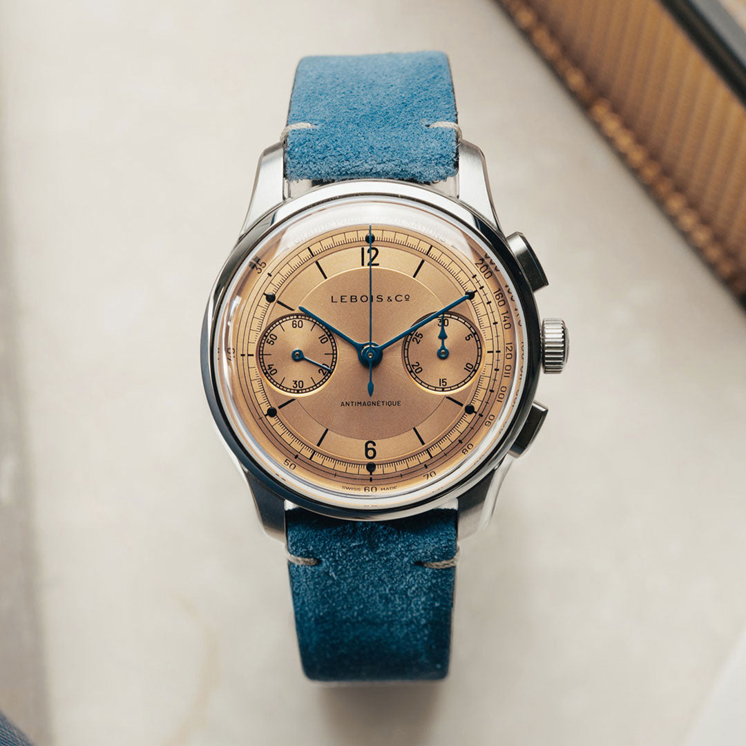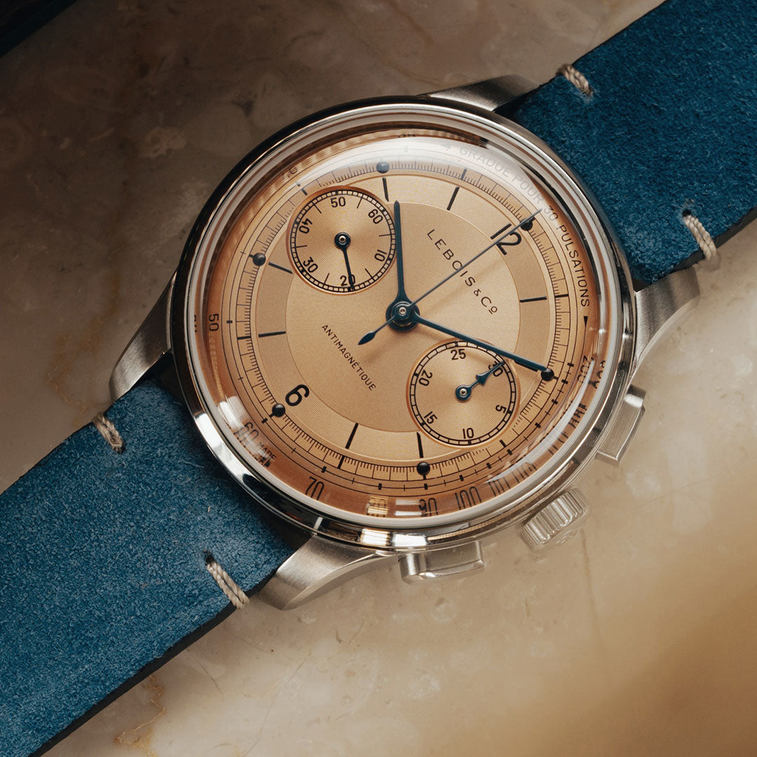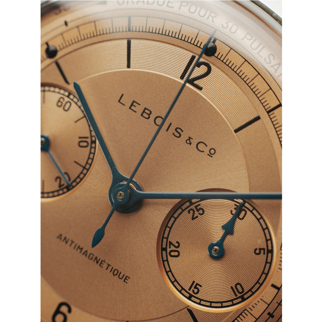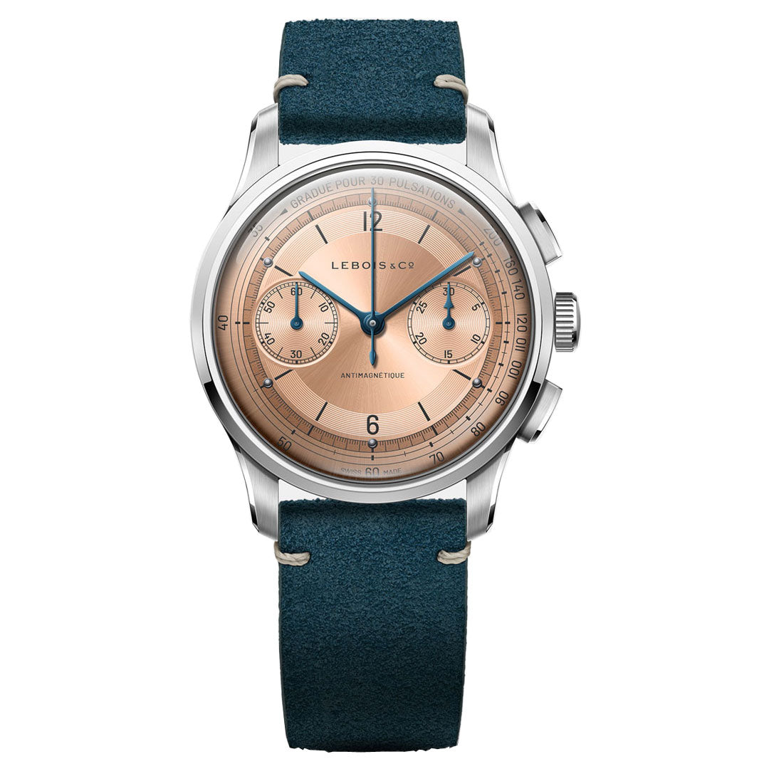 The ‘Gradue Pour 30 Pulsations’ pulsation dial was a surprising outcome of CoLAB. Initially proposed as white/silver or black dial with lume dots, the community recommended this warm salmon-coloured dial with metal dots. In this dial, we echoed the azurage pattern of the Avantgarde and Venturist behind the indexes. We took inspiration for the hands from watches 2, 8 and 9 from the first step of the Heritage Chronograph CoLAB project.