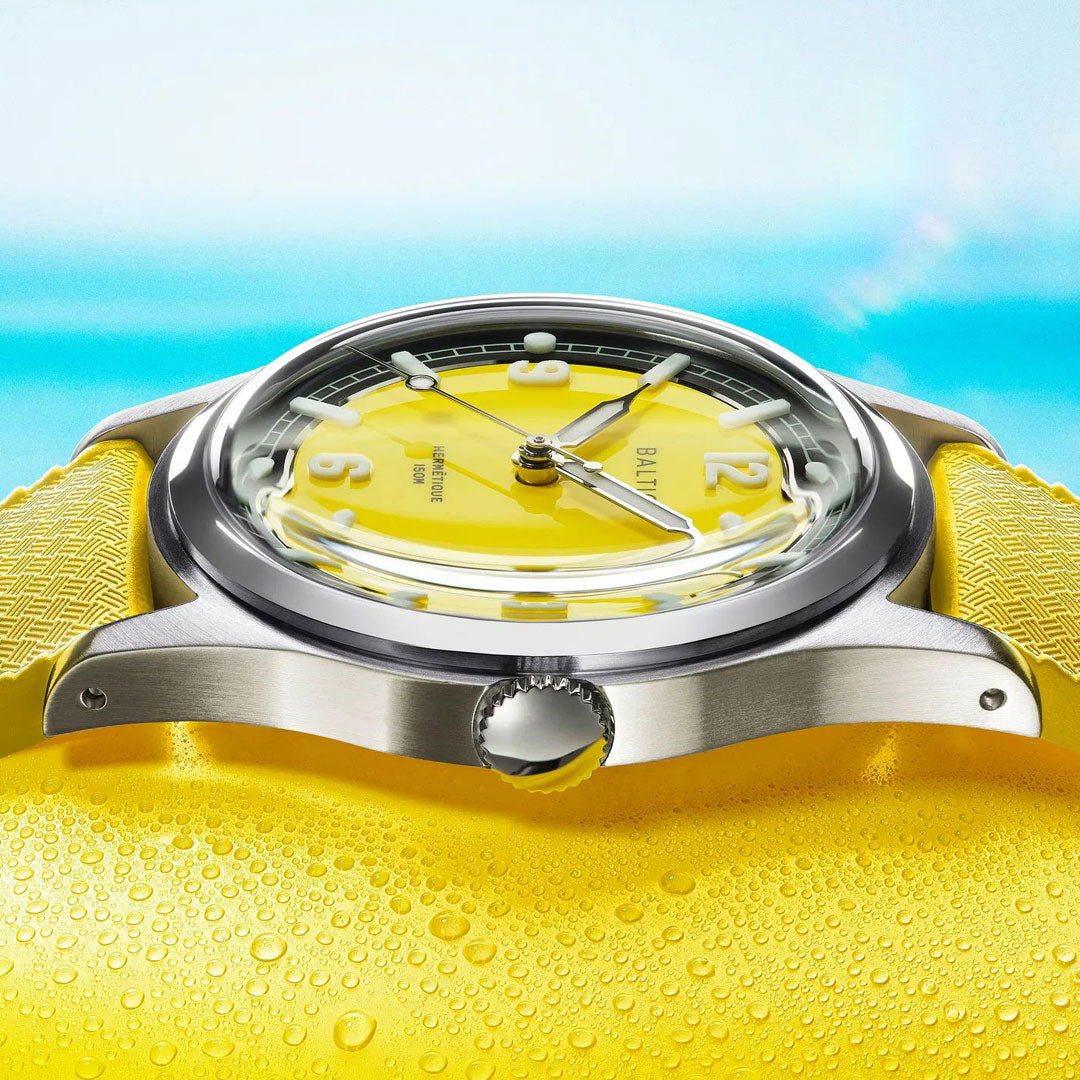 The appliques of the Hermétique Summer Yellow are made of Super-Luminova® BGW9, one of the most powerful luminescent materials in terms of intensity and durability, while the hands are coated with it. It ensures optimum legibility in the dark, specifically thanks to these 0.5mm-thick "super indexes".