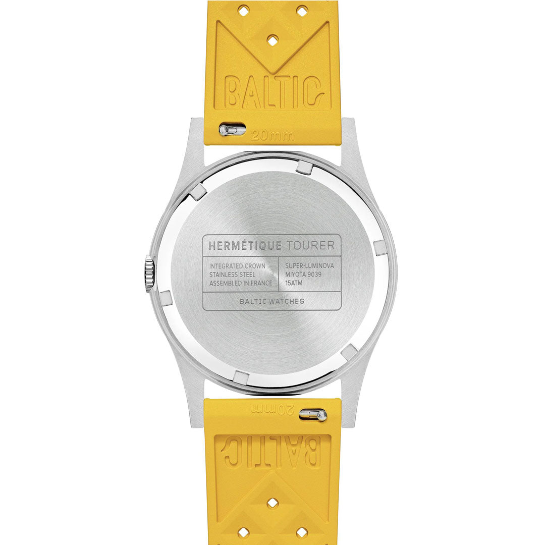 The Hermétique Summer is equipped with calibre 9039, a self-winding movement with a 42-hour power reserve developed by the Japanese manufacture Miyota. Chosen for its robustness and reliability, it ensures this field watch's optimum precision in all conditions and environments.