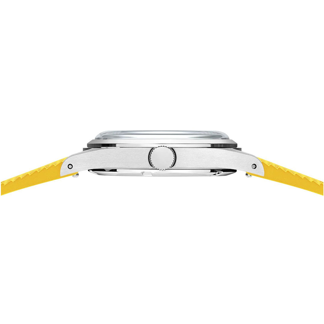 Its integrated crown offers comfort and flexibility, allowing you to wear the watch on your left or right wrist, as you prefer. The case is brushed horizontally along the sides, circularly on the lugs and features a polished bezel.