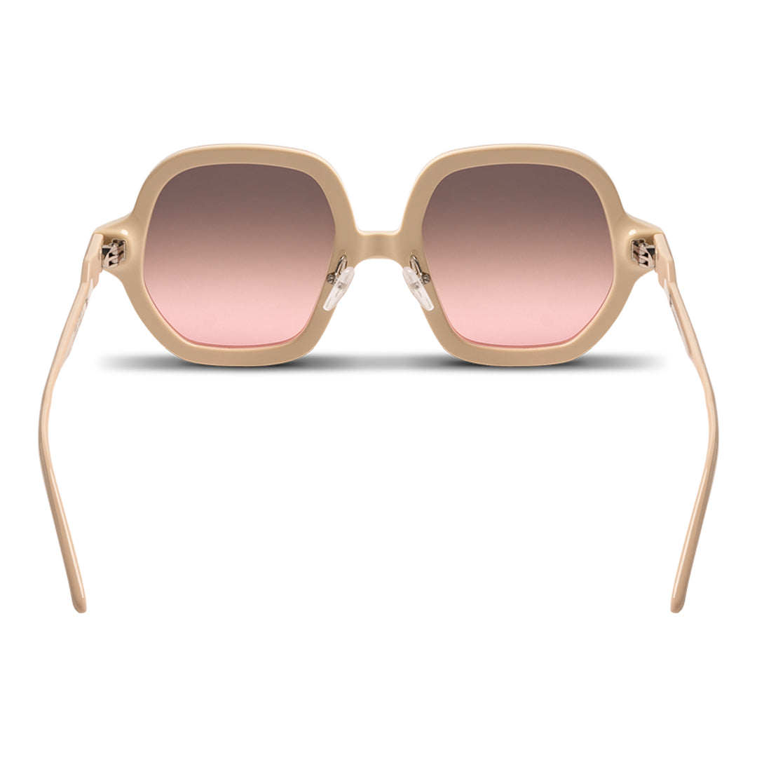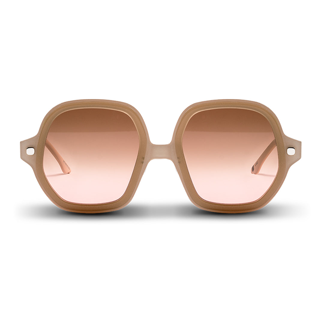 Double layer of acetate, caffè latte & glittery beige . Applied polished TV shape signature. ICF1/01: Oversized frames with mid bridge position. Front width: 154,4mm Lenses: H:53,6mm, W:53,3mm. Nose pads: ICF1/01: Adjustable silicone pads.