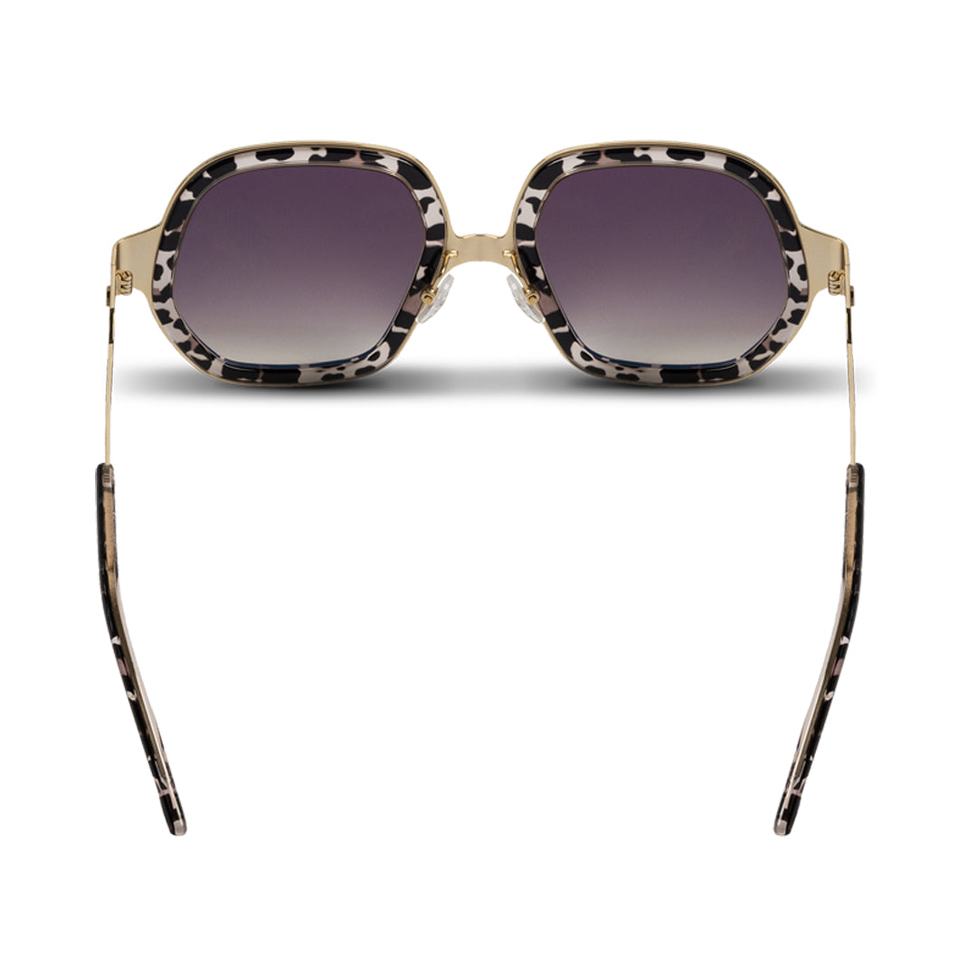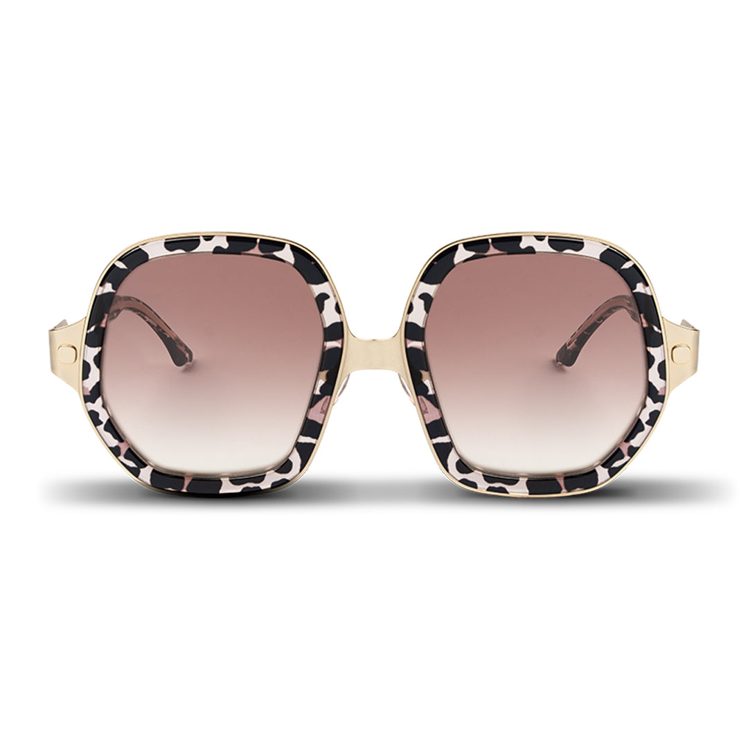 Matt stainless steel frame with Gold 2N nickel-free PVD treatment. Applied matt TV shape signature Large frames with upper bridge position. Oversized frames with mid bridge position. Front width: 154.4mm. Lenses: 53.6mm (H) X 53.3mm (W). Polished yellow/cheetah acetate framing the lenses, front and back.