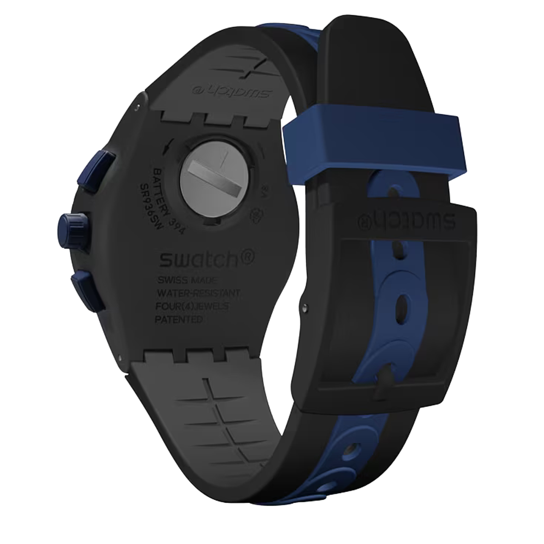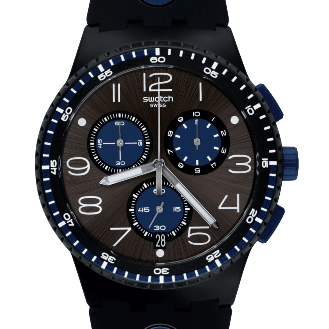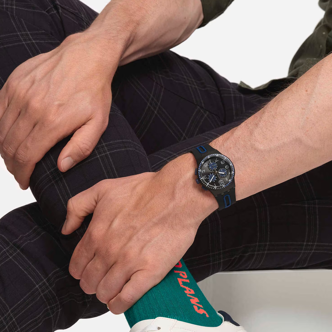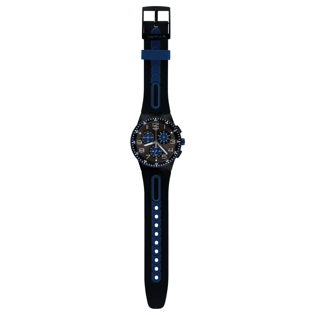 The KAICCO (SUSB406) watch is set apart with a black sun-brushed dial featuring white, blue, and black prints, and Arabic numerals. Three counters and a date window at 6 o'clock make it a functional modern favorite. The bezel is rendered in solid matte black with multi-colored prints, and the case is designed in matte black. A black strap features bright blue accents for a graphic, textural effect.