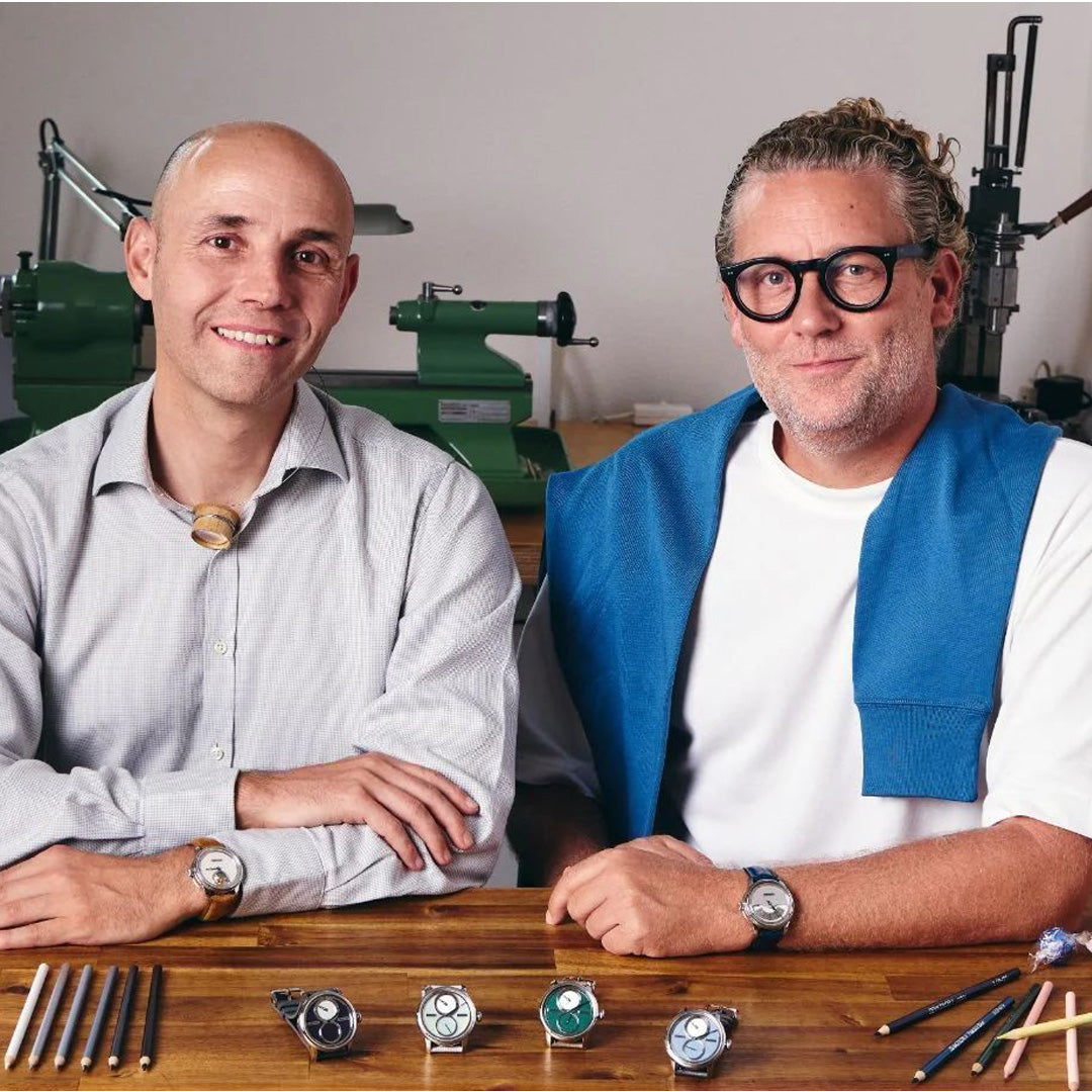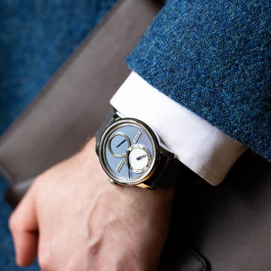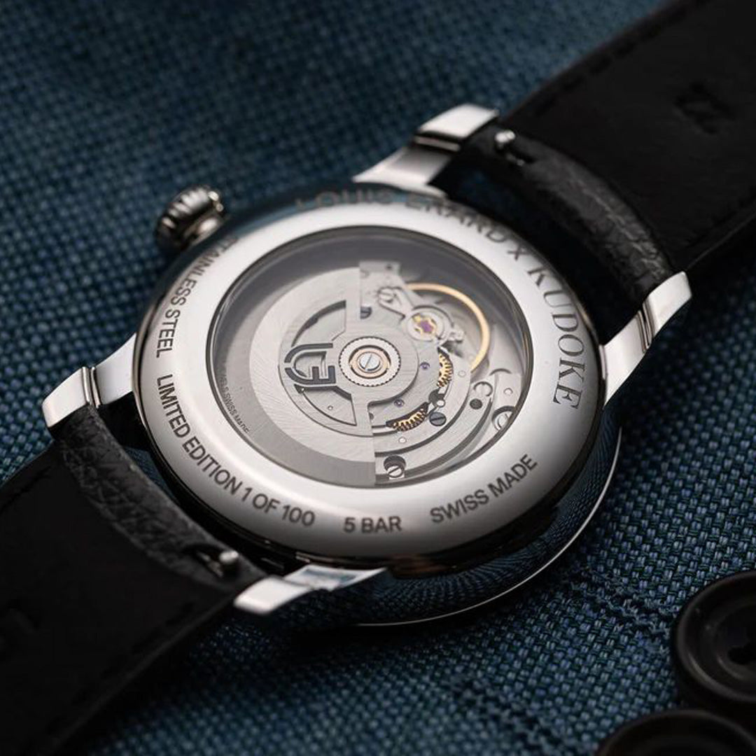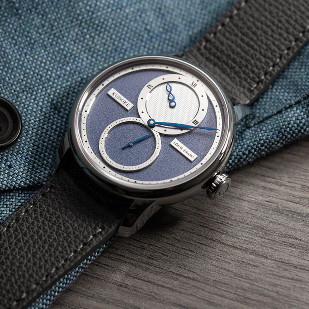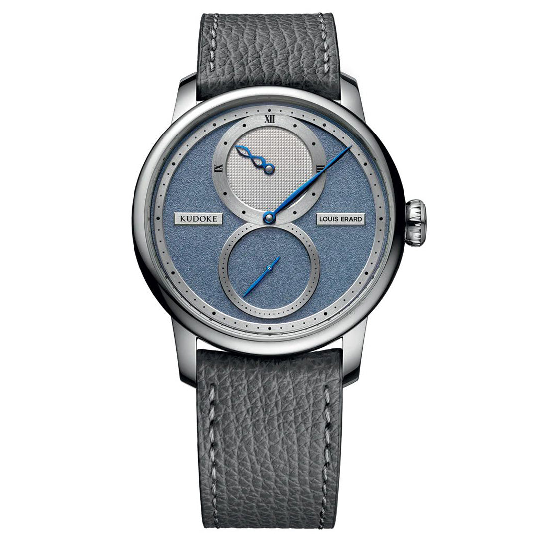 Framed by a 42 mm polished stainless steel case, the dial features KUDOKE’s distinctive watchface elements. The railway-track chapter ring, two counter rings as well as the “LOUIS ERARD” and “KUDOKE” nameplates are satin-finished and rhodium-plated. The “12 o’clock” counter is adorned with a “Clous de Paris” hobnail pattern, a ring bearing Roman numerals counter and the iconic infinity-shaped hours hand, while all hands are in blued steel. The lower part of the dial has a grained finish for a frosted effect and comes in three different colors: purple (limited to 78), forest green (100), light blue (100); while the fourth variation is a collector alert with its white mother-of-pearl dial (78).