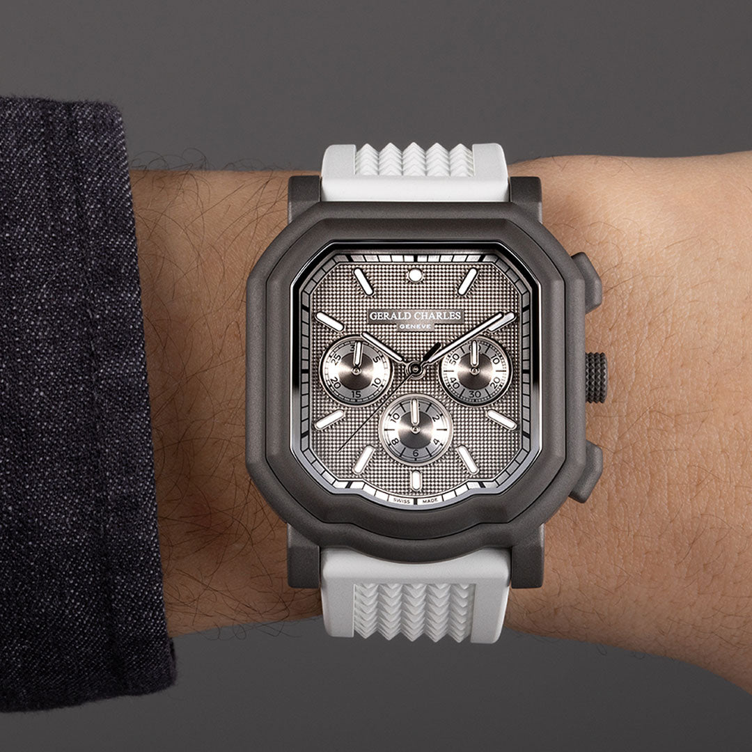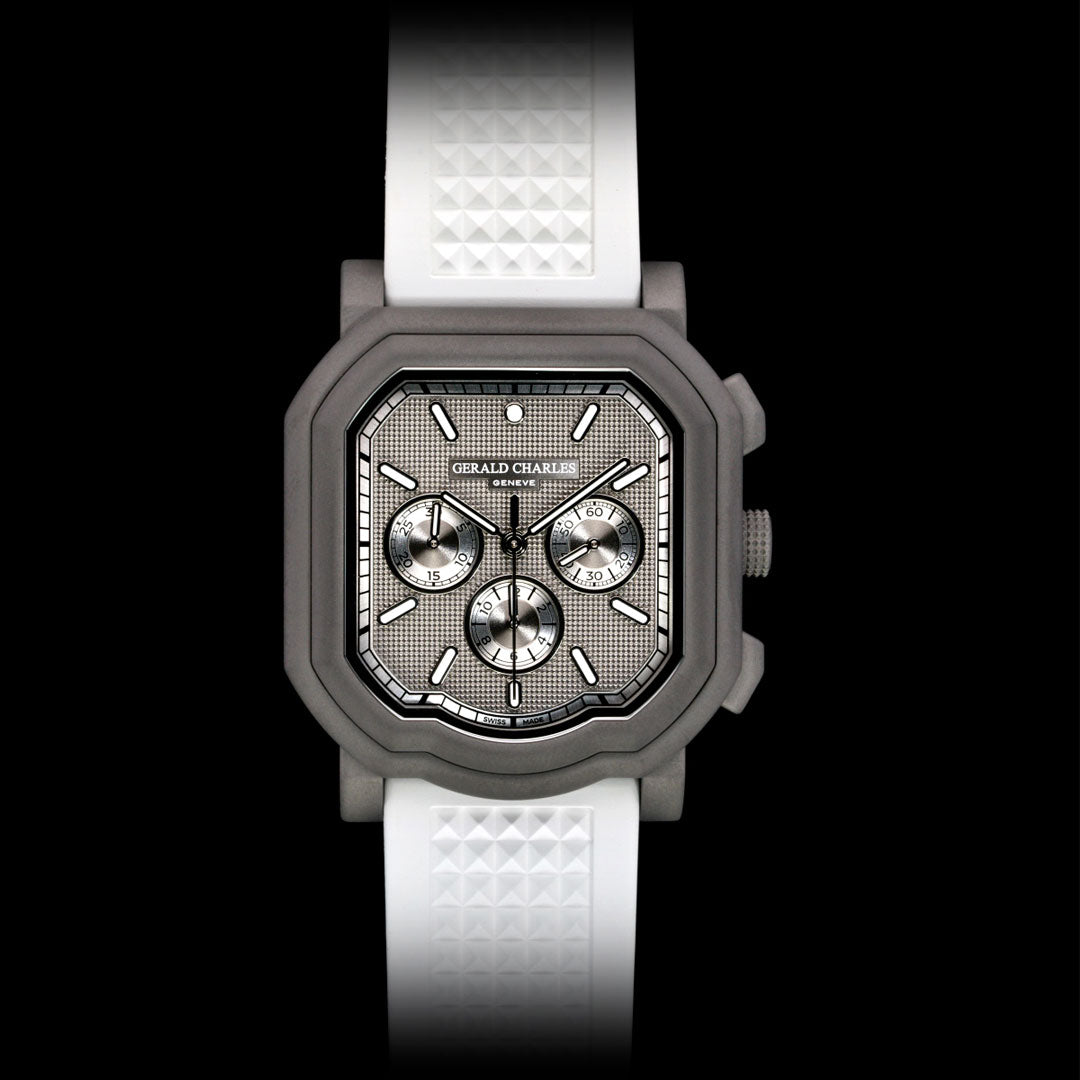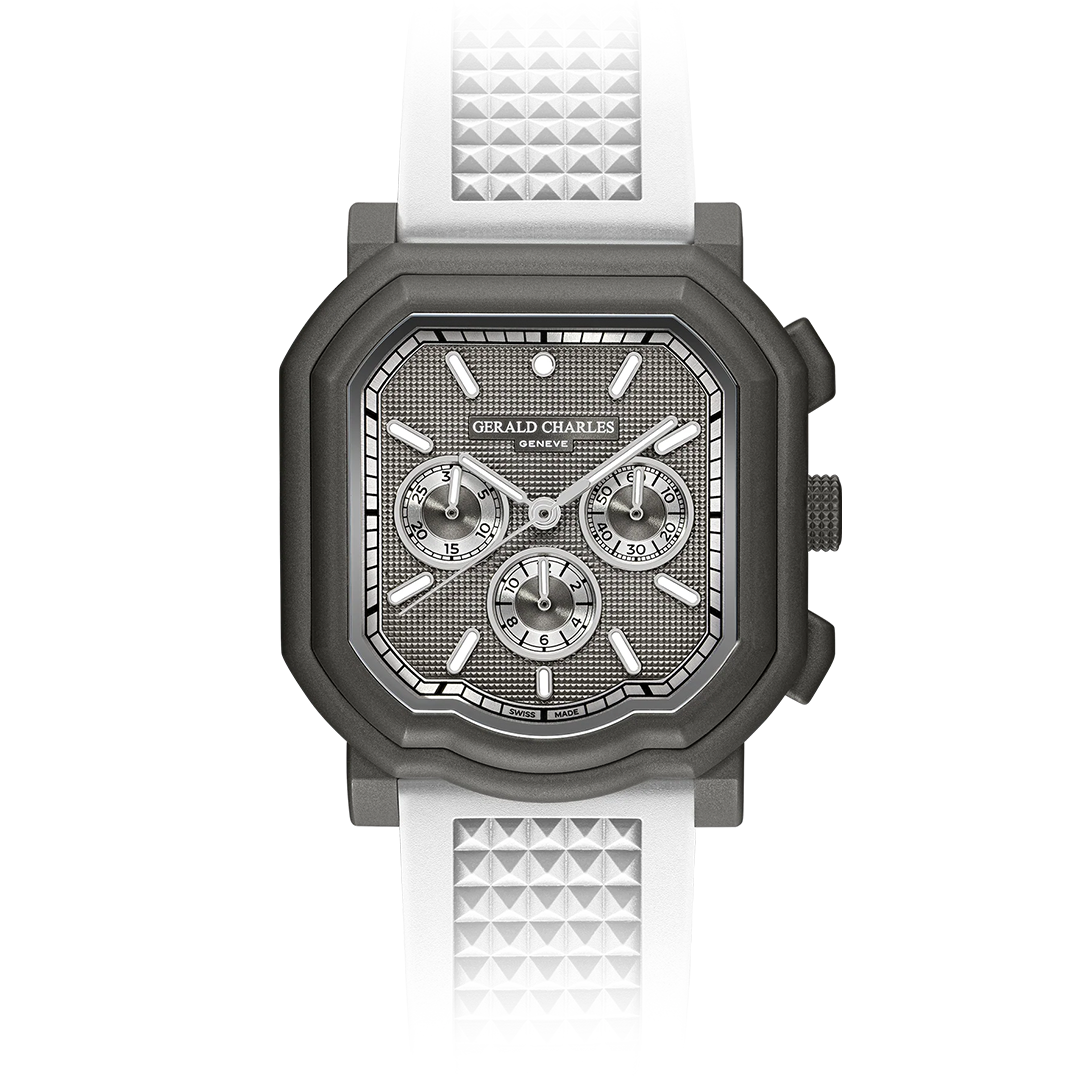 The strap is presented in white vulcanised rubber, featuring a Clous de Paris finish on the top side and the signature Gerald Charles logo tapisserie on the rear, secured with a Darkblast® Grade 5 Titanium pin buckle engraved with the GC logo.